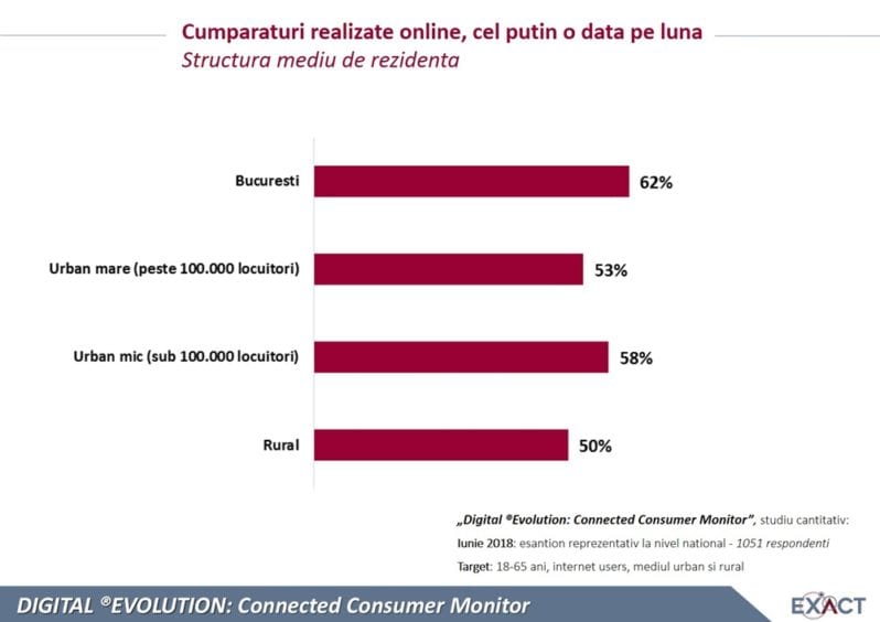 Reading Time: 2 minutePeste jumătate din românii utilizatori de internet cumpără online cel puțin o dată pe lună (55%), arată studiul cantitativ ”Digital Evolution: Connected Consumer Monitor”, realizat de EXACT Business Solutions în iunie 2018.