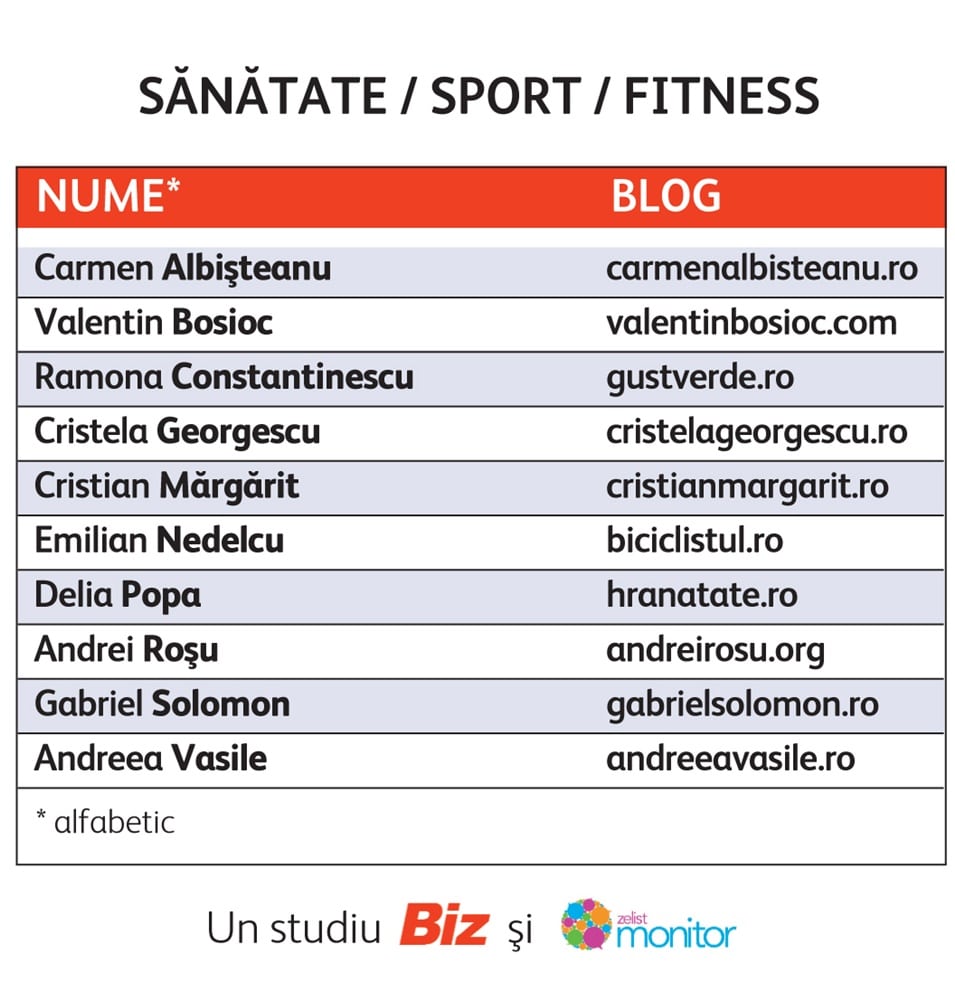 Reading Time: < 1 minutCu totii vrem o viata sanatoasa, dar ne fura activitatile zilnice. Sau gasim alte scuze. Totusi, atunci cand ii vedem pe altii ca reusesc, fie cu sport, fie cu diete si mancare sanatoasa, parca ne ambitioneaza si ne urnesc din amorteala. Ca atare, stam cu ochii pe bloggerii care ne pun in miscare.