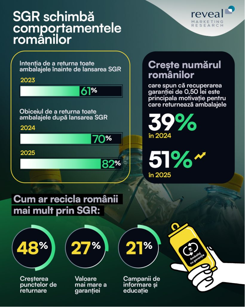 „Rezultatele studiului arată o adaptare rapidă a românilor la Sistemul de Garanție-Returnare, cu un procent în creștere al celor care returnează toate ambalajele, motivați în principal de recuperarea garanției plătite. Totodată, 36% dintre români spun că și-au modificat comportamentul de cumpărare ca urmare a implementării SGR. În acest context, studiile de tip Customer Decision Journey pot fi un instrument valoros pentru brandurile care vor să înțeleagă mai bine cum influențează aceste schimbări criteriile și deciziile de achiziție ale consumatorilor,” a declarat Marius Luican, Director General Reveal Marketing Research.