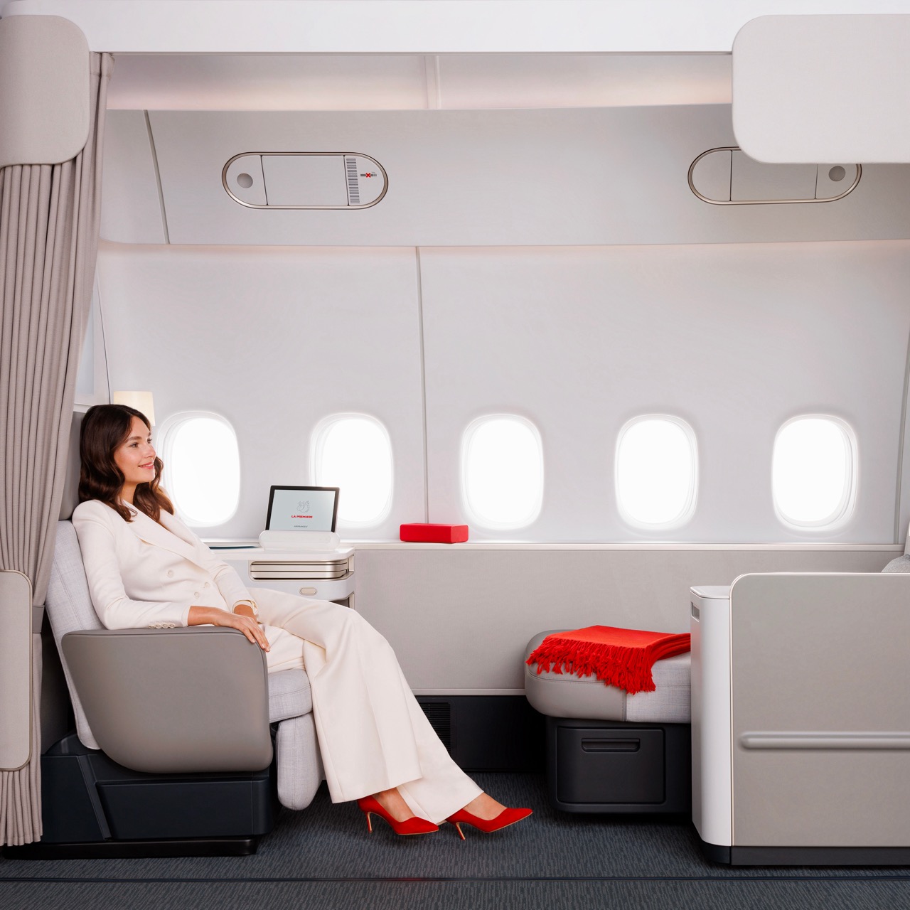 Noua suită La Première, disponibilă treptat pe o selecție de aeronave Boeing 777-300, se desfășoară pe cinci hublouri și propune un concept unic, complet modular. Include un fotoliu și un șezlong care se transformă într-un pat adevărat. Fotoliul se adaptează fiecărei etape a zborului – decolarea, aterizarea, servirea mesei sau relaxarea. Este realizat din spumă cu memorie ergonomică, care se mulează perfect pe corpul pasagerului pentru un confort desăvârșit. În fața scaunului, șezlongul permite oaspeților să se odihnească în orice poziție, ideal pentru citit sau vizionarea unui film. Pentru un somn liniștit la 10.600 de metri altitudine, acesta se extinde într-un pat plat de 2 metri lungime. Fiecare dintre cele patru suite este izolată de o cortină groasă, din material textil fin, care oferă intimitate totală – de la podea până la tavan – într-o atmosferă caldă și exclusivistă.