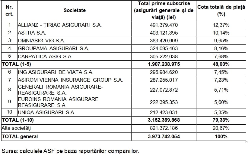 Primele 10 societati de asigurare au generat aproape 80% din valoarea totala a primelor brute subscrise, atat pe segmentul asigurarilor generale, cat și pe cel al asigurarilor de viata.