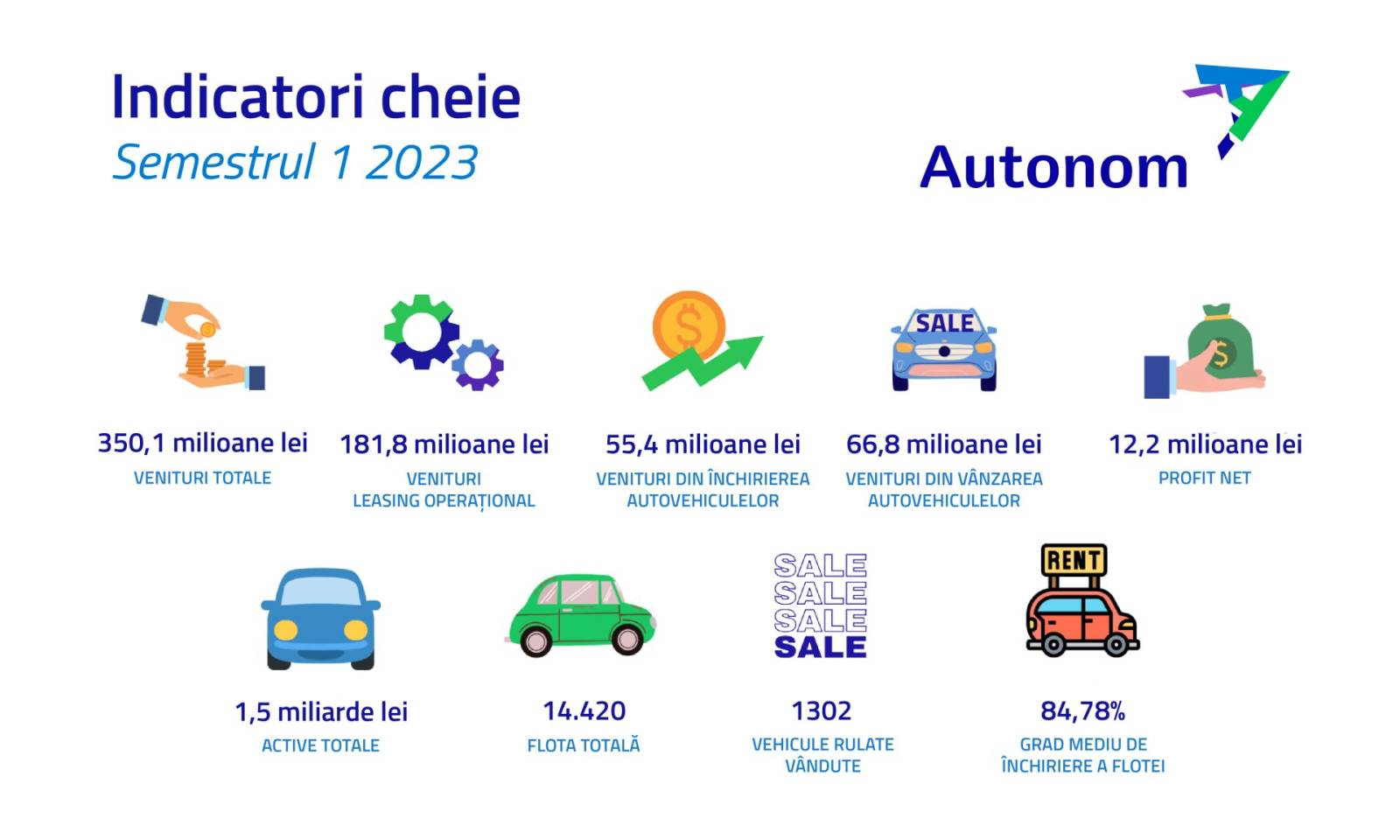 Reading Time: 3 minuteAutonom Services SA, cea mai extinsă rețea de mobilitate din România, raportează rezultate în creștere cu două cifre pe toate liniile principale de business, pentru primul semestru din 2023. Compania a înregistrat venituri totale de 350,1 milioane lei, în creștere cu 46% față de primele 6 luni ale lui 2022 și un profit net de 12,2 milioane lei, în scădere cu 31% față de aceeași perioadă raportată anterior.