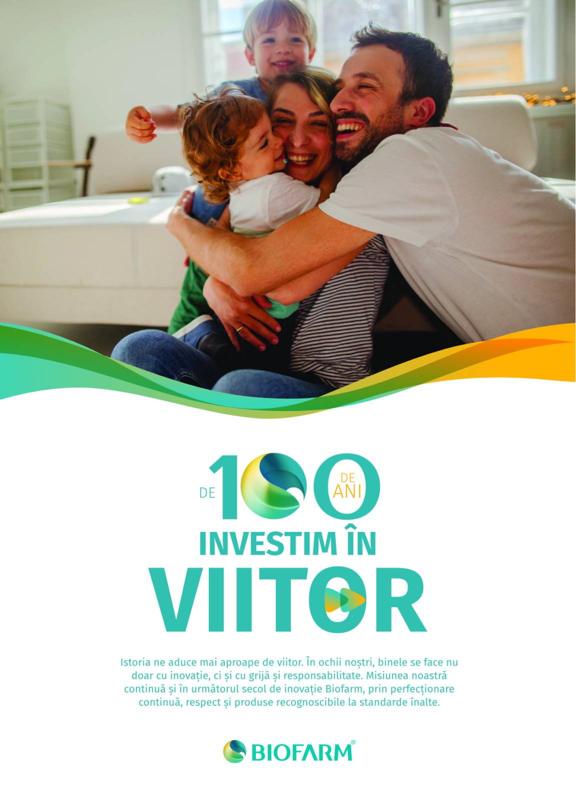 Campania aniversară ,,De 100 de ani investim în viitor” vine să reitereze misiunea Biofarm de a acționa mereu spre binele oamenilor și subliniază spiritul inovator care ghidează activitatea producătorului pentru a împlini nevoile consumatorului și a fi în pas cu cerințele unei piețe farmaceutice exigente.