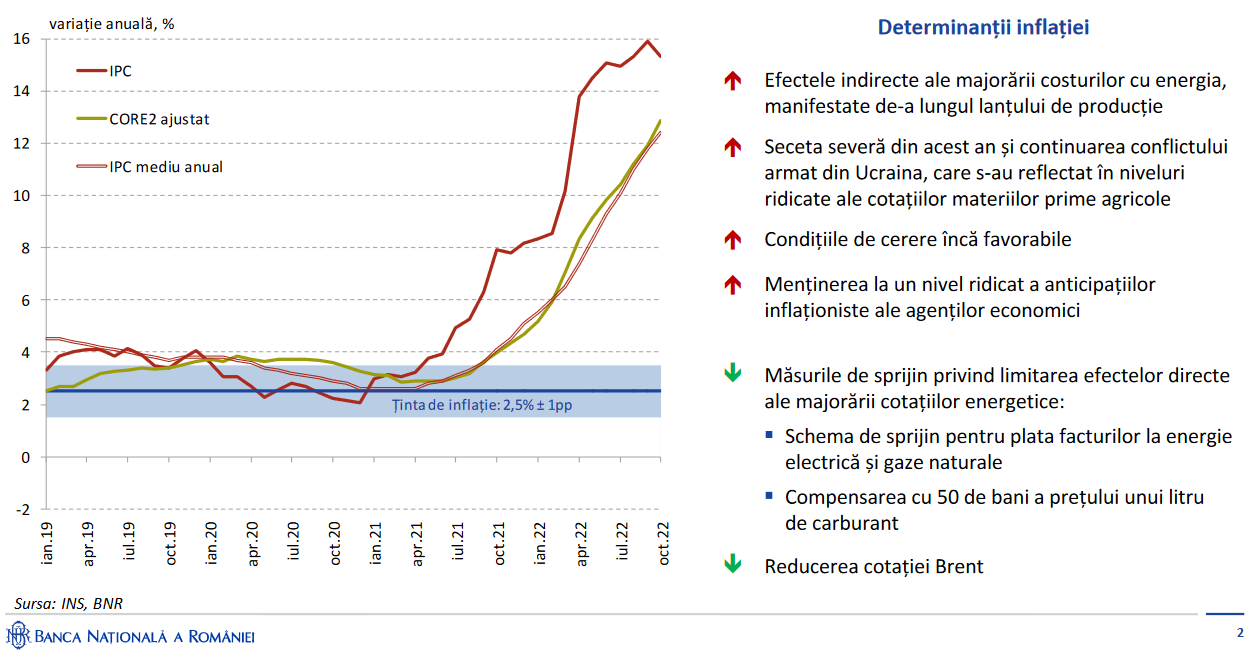 ”Scenariul de bază are în vedere menținerea sancțiunilor economice impuse Rusiei pe tot intervalul proiecției. De asemenea, se presupune că nu vor fi aplicate raționalizări pe scară largă ale consumului de energie în țările europene, de natură să perturbe semnificativ activitatea economică. (…) Scenariul de bază a inclus măsurile de plafonare a prețurilor în vigoare la momentul aprobării Raportului asupra inflației (8 noiembrie 2022), care expiră la 31 august 2023. (…)