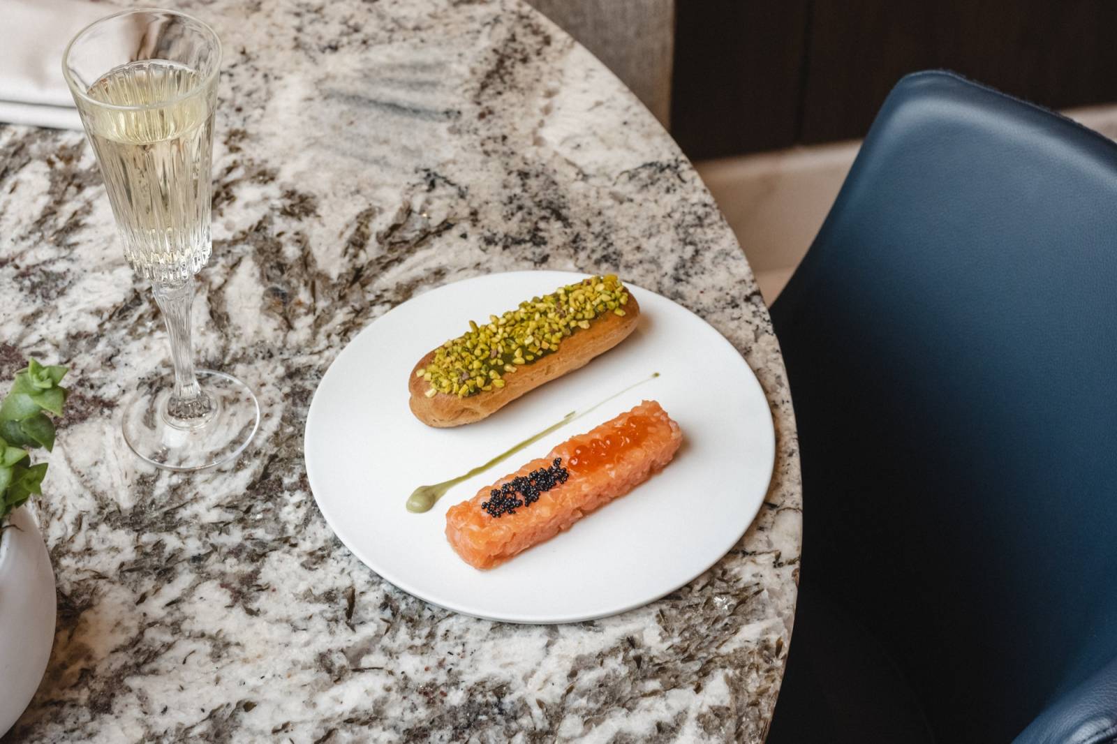 Un element inedit al meniului îl constituie preparatele de tip trompe l’oeil: inspirate de aspectul clasic al deserturilor, aceste creații sunt reinterpretate cu ingrediente sărate, perfect de savurat în orice moment al zilei. Eclerul ascunde un tartar fin de somon în pâte à choux crocante, iar millefeuille-ul, aparent un desert, dezvăluie straturi delicioase de hummus.