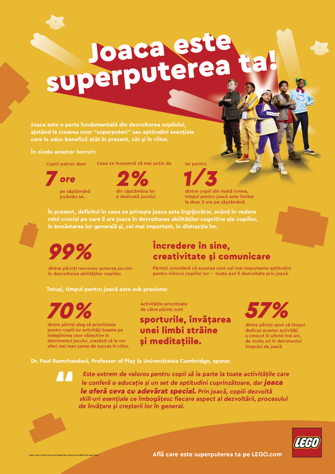 Reading Time: 4 minuteGrupul LEGO lansează azi noua campanie Joaca este superputerea ta, ce vorbește despre lipsa jocului înregistrată în rândul copiilor, la nivel global. Împreună cu Gașca de Joacă, formată din susținători din toată lumea, Grupul LEGO inspiră familiile să reprioritizeze joaca, punând accent pe importanța crucială a acesteia în dezvoltarea din timpul copilăriei și pe distracția pe care joaca o aduce în familiile de pretutindeni.