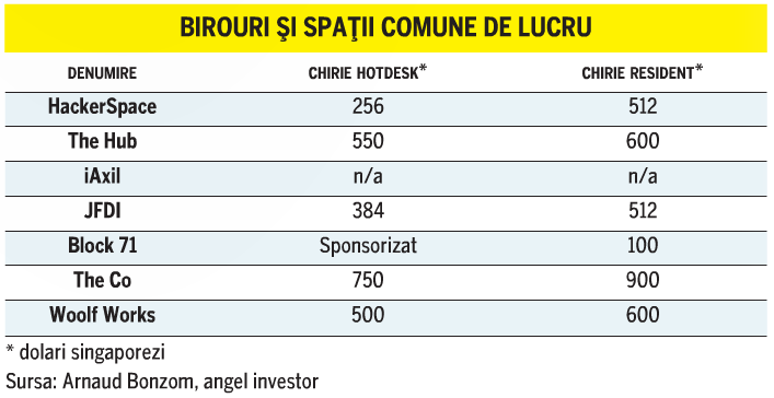 Pentru a ne convinge ca aceasta comparatie e cat se poate de autentica, e suficient sa ne uitam la spatiile de lucru pentru start-up-uri (celebrele “coworking spaces”). In urma cu cinci ani, singurul astfel de loc in care tinerii antreprenori se puteau intalni era HackerSpace, fondat de Meng Wong si Hugh Mason. In prezent, Singapore gazduieste nu mai putin de 12 astfel de locuri, fiecare cu particularitatile sale.