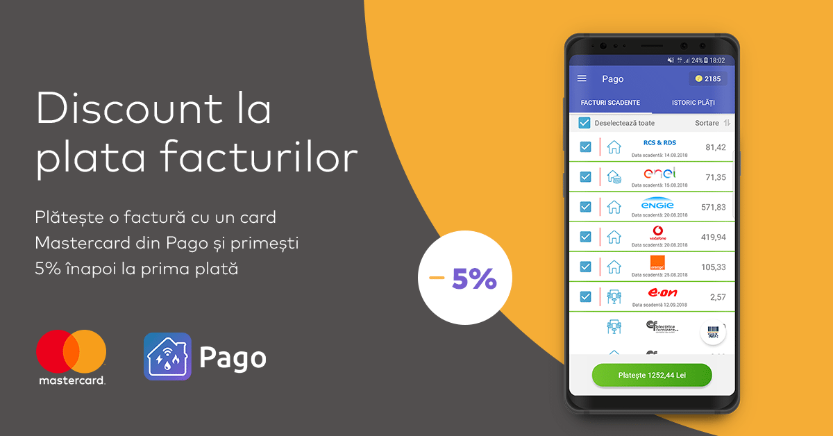 Simultan, Mastercard și Pago au lansat o campanie promoțională în cadrul căreia utilizatorii aplicației Pago beneficiază de 5% cash-back la prima plată a unei facturi prin intermediul unui card Mastercard. Valoarea cash-back va fi disponibilă utilizatorilor Pago sub formă de puncte, fiind adăugată în contul acestora imediat după efectuarea plății unei facturi. Campania promoțională este activă până în luna decembrie a acestui an și se adresează atât utilizatorilor noi, cât și celor peste 90.000 de utilizatori actuali ai Pago, anunță companiile, într-un comunicat de presă.