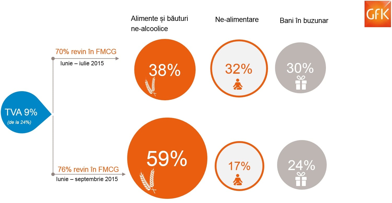 Comportamentul de cumparare a suferit modificari fata de momentul prim al impactului scaderii preturilor. La inceput, deși tot aproximativ 70% reveneau in FMCG, proportia dintre produsele alimentare și cele nealimentare a fost aproximativ egala (iunie – iulie 2015).