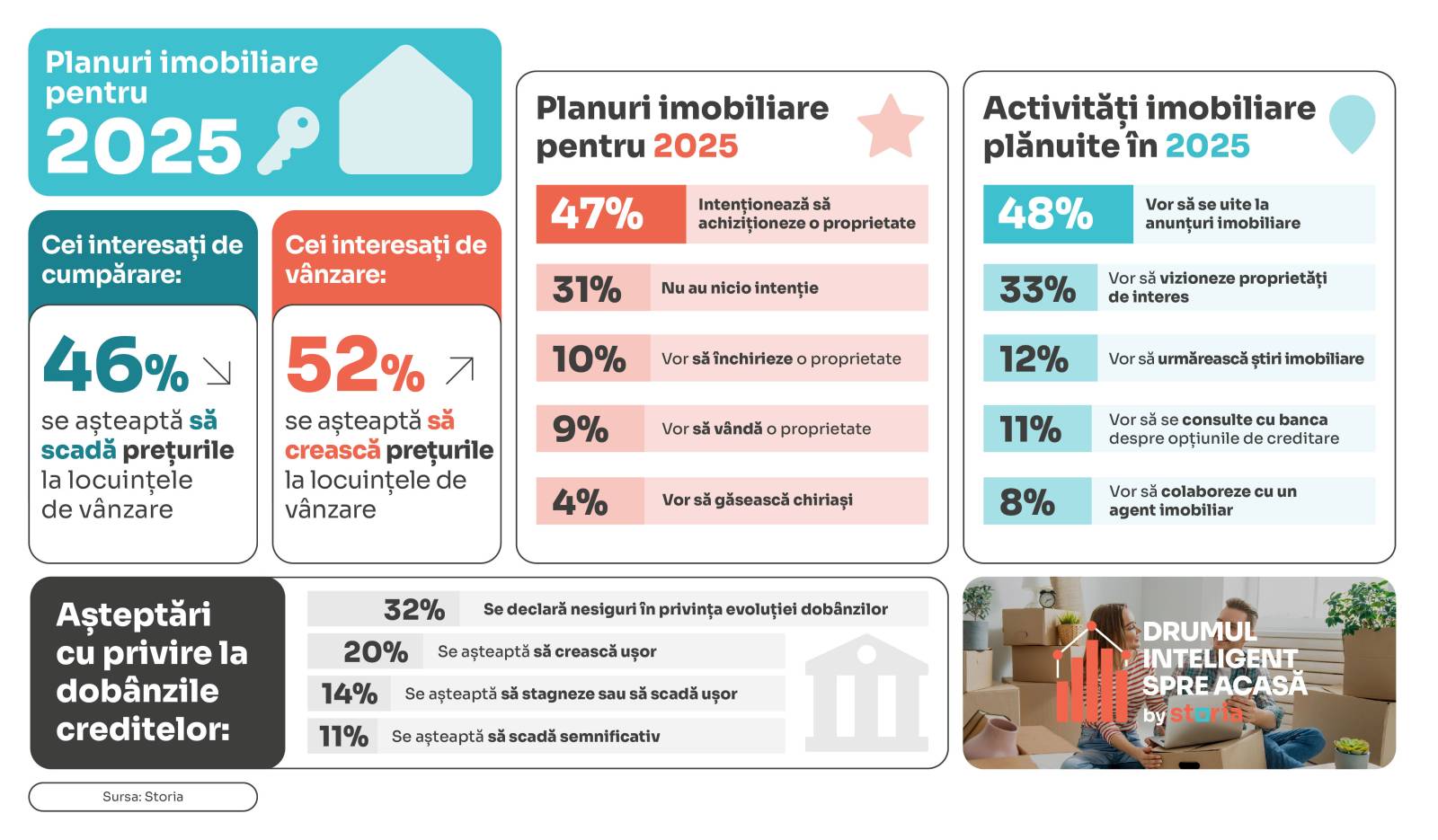 Conform studiului, în anul 2025 utilizatorii de pe platforma Storia își propun să vizualizeze anunțuri imobiliare (48% din totalul respondenților), în timp ce 33% vor să vizioneze proprietățile de interes. De asemenea, 12% dintre respondenți au în plan să urmărească știri imobiliare, 11% vor să se consulte cu banca despre opțiunile de creditare disponibile, iar 8% vor să colaboreze cu un agent imobiliar.