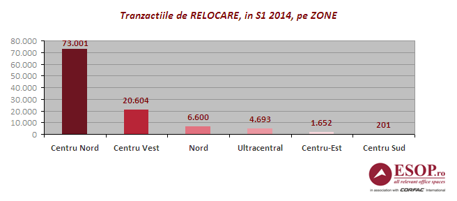 Ordinea in clasament s-a schimbat de la locul doi in jos: pe pozitia secunda a urcat Centru-Vest, iar Nordul a coborat pe trei. Zona ultracentrala se afla pe locul patru, urcand cu o pozitie, la un volum de spatii inchiriate aproape egal cu cel din prima jumatate din 2013.