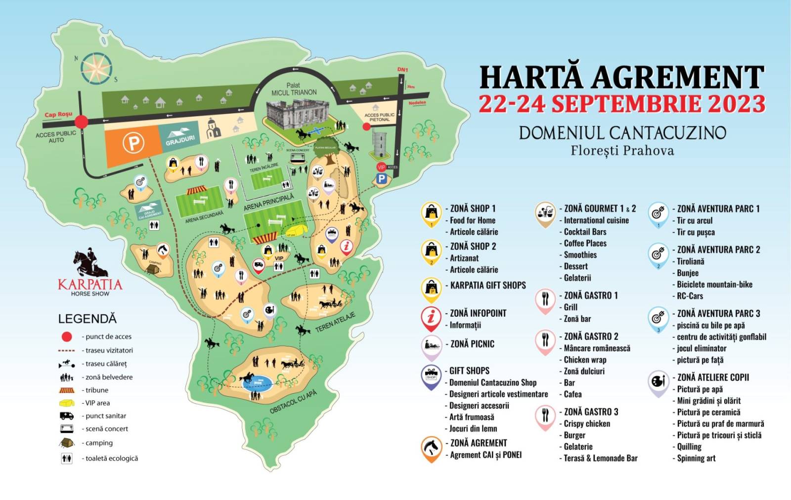 Pe parcursul celor trei zile, spectatorii vor avea ocazia să se familiarizeze nu numai cu diferitele discipline ecvestre, printre care și Working Equitation (Arena Secundară), ci să practice și călărie de agrement. Adulții se vor putea relaxa în punctele gastronomice si de picnic de pe Domeniul Cantacuzino ori în zona gourmet și lifestyle. Copiii se vor bucura de un spațiu vast cu activități interactive în natură, ateliere de pictură și olărit, aventura park, tiroliana, plimbări cu jeep-uri și un parc de joacă gonflabil pentru toate vârstele.
