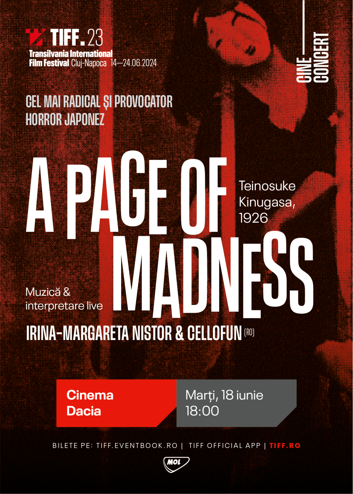 Lista cine-concertelor TIFF.23 continuă cu un horror japonez provocator – „A Page of Madness” / O filă de nebunie (r. Teinosuke Kinugasa, Japonia, 1926), în interpretarea live a Irinei-Margareta Nistor și a formației CelloFun. A Page of Madness este un thriller experimental mut. Considerat ca fiind pierdut timp de 45 de ani, filmul este produsul unui grup avangardist de artiști din Japonia, cunoscut sub numele de Shinkankakuha (Școala Noilor Percepții), care a încercat să depășească reprezentarea naturalistă în film, fiind influențat de cinematografia expresionismului german. Evenimentul va avea loc marți, 18 iunie, de la ora 18:00, la Cinema Dacia.