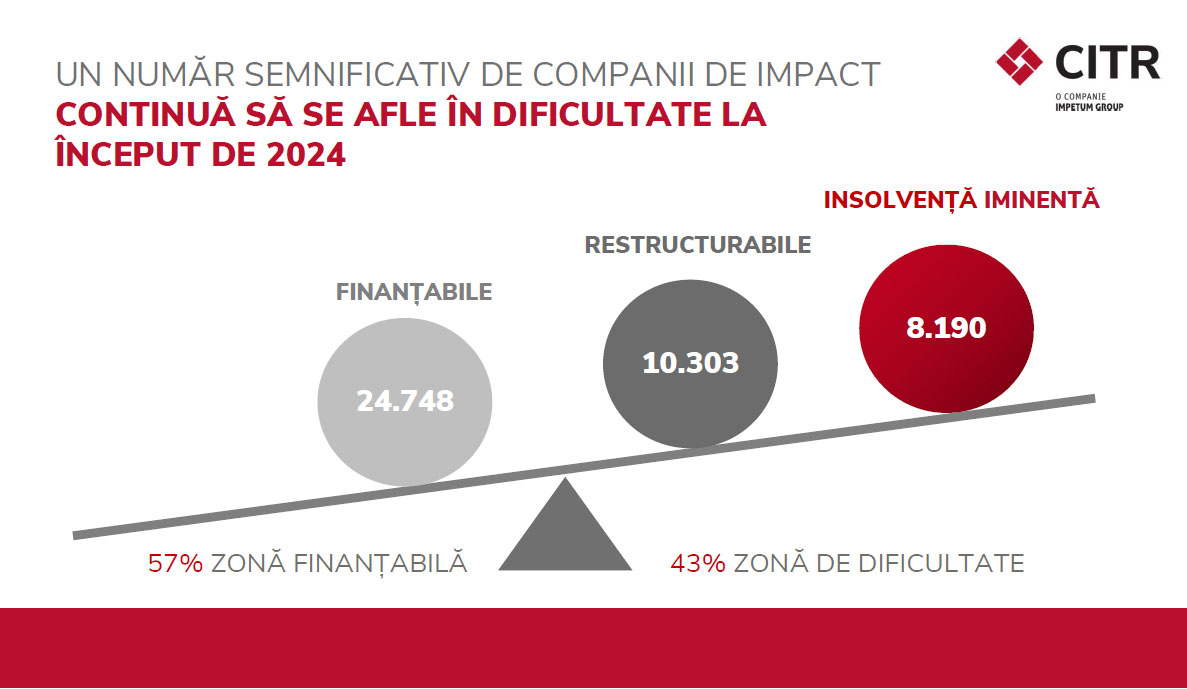 Reading Time: 3 minuteNumărul companiilor de impact aflate în insolvență iminentă crește cu 18%, de la 6.949 la 8.190, iar cel al companiilor de impact aflate în dificultate atinge cel mai înalt nivel din 2013 până în prezent, potrivit celui mai recent studiu asupra companiilor de impact realizat de CITR, lider al pieței de insolvență și restructurare.