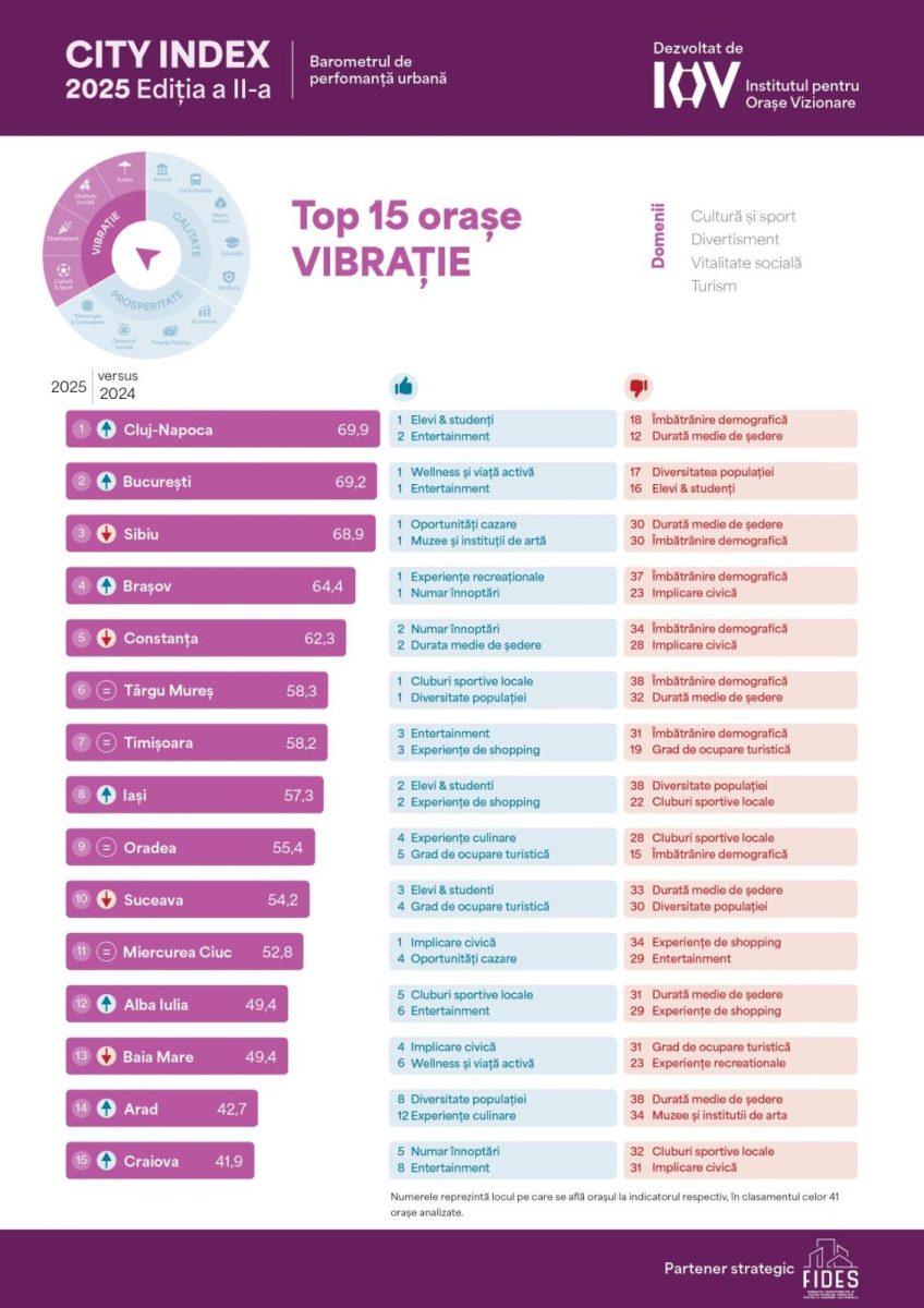 În 2025, pe componenta Vibrație, Cluj-Napoca trece în poziție de lider (ocupată anul trecut de Sibiu), urmat de București, cu Sibiu pe locul 3. Brașovul și Constanța completează Top 5. Cluj-Napoca excelează la indicatorii Elevi & Studenți (locul 1) și Entertainment (locul 2), Bucureștiul este lider la Wellness și Viață activă și Entertainment. Sibiul continuă să aibă cele mai mari scoruri la Oportunități de cazare, Locuri emblematice și Muzee și instituții de artă, ceea ce confirmă atractivitatea sa turistică. Brașovul a urcat pe locul 4, fiind și el lider la Experiențe recreaționale si Număr înnoptări. O premieră este intrarea Craiovei în Top 15 Vibrație, cu scoruri mai mari la Numărul de innoptări (locul 5) și Entertainment (locul 8). Interesante în această componentă sunt și Târgu Mureș (locul 1 la Cluburi sportive locale și Diversitatea populației) și Miercurea-Ciuc (locul 1 la Implicare civică, pentru al doilea an).