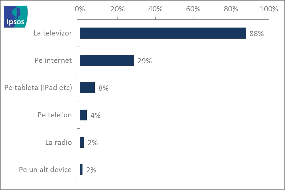 Majoritatea romanilor care declara ca vor umari meciurile aleg modalitatea cea mai simpla – la televizor (aproximativ noua din zece), doar trei din zece romani intentionand sa urmareasca competitia pe internet. Si pentru ca fotbalul inseamna socializare alaturi de cei apropiati, celelalte terminale, care sunt mai putin potrivite vizionarii in grup, sunt preferate in mai mica masura: tableta – 8%, telefon mobil – 4%, radio – 2%.