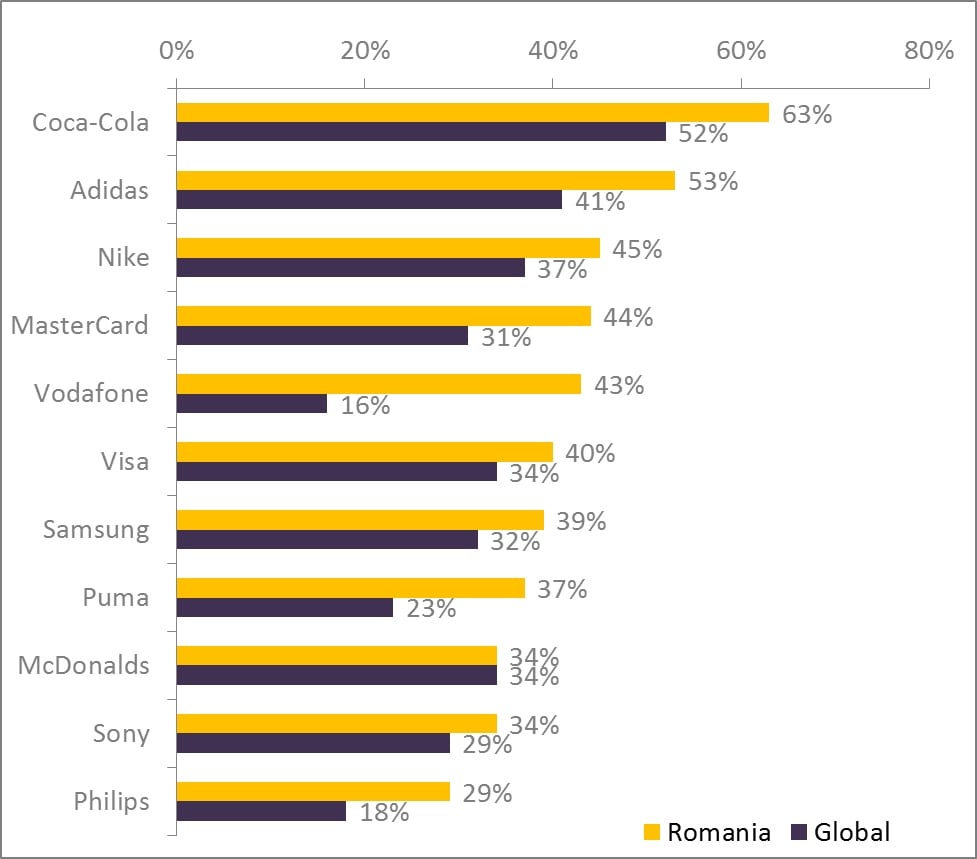 Romanii sunt insa mai receptivi la numele sponsorilor: in medie, un roman poate spune spontan un numar de 7 sponsori ai Campionatului Mondial – comparativ cu Marea Britanie (4) sau Franta (5). Totusi, in randul romanilor nu s-au format afinitati aparte, topul global al primelor trei marci fiind indentic cu topul romanilor: Coca Cola (63%), Adidas (53%), Nike (45%). Apar diferente pentru urmatoarele doua clasate: MasterCard (locul 7 mondial) si Vodafone (locul 17 mondial).