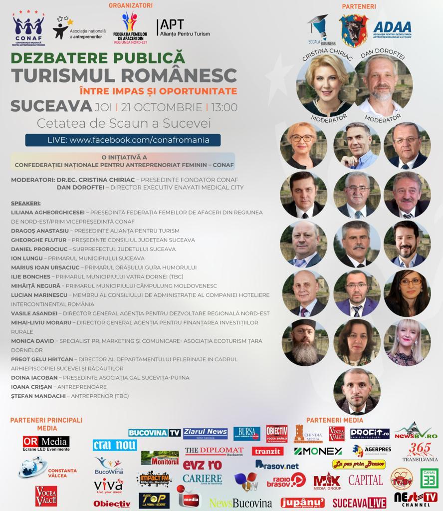 Dezbaterea organizată la Suceava aduce față în față autoritățile locale cu mediul de afaceri, reprezentanți din domeniul turistic la nivel regional și național, în dorința de a găsi oportunități de creștere și dezvoltare a turismului, în toate formele sale: religios, balnear, istoric, de agrement, ospitalier. Evenimentul va fi moderat de Cristina Chiriac, președinta Confederației Naționale pentru Antreprenoriat Feminin (CONAF) și Dan Doroftei, director executiv Enayati Medical City.