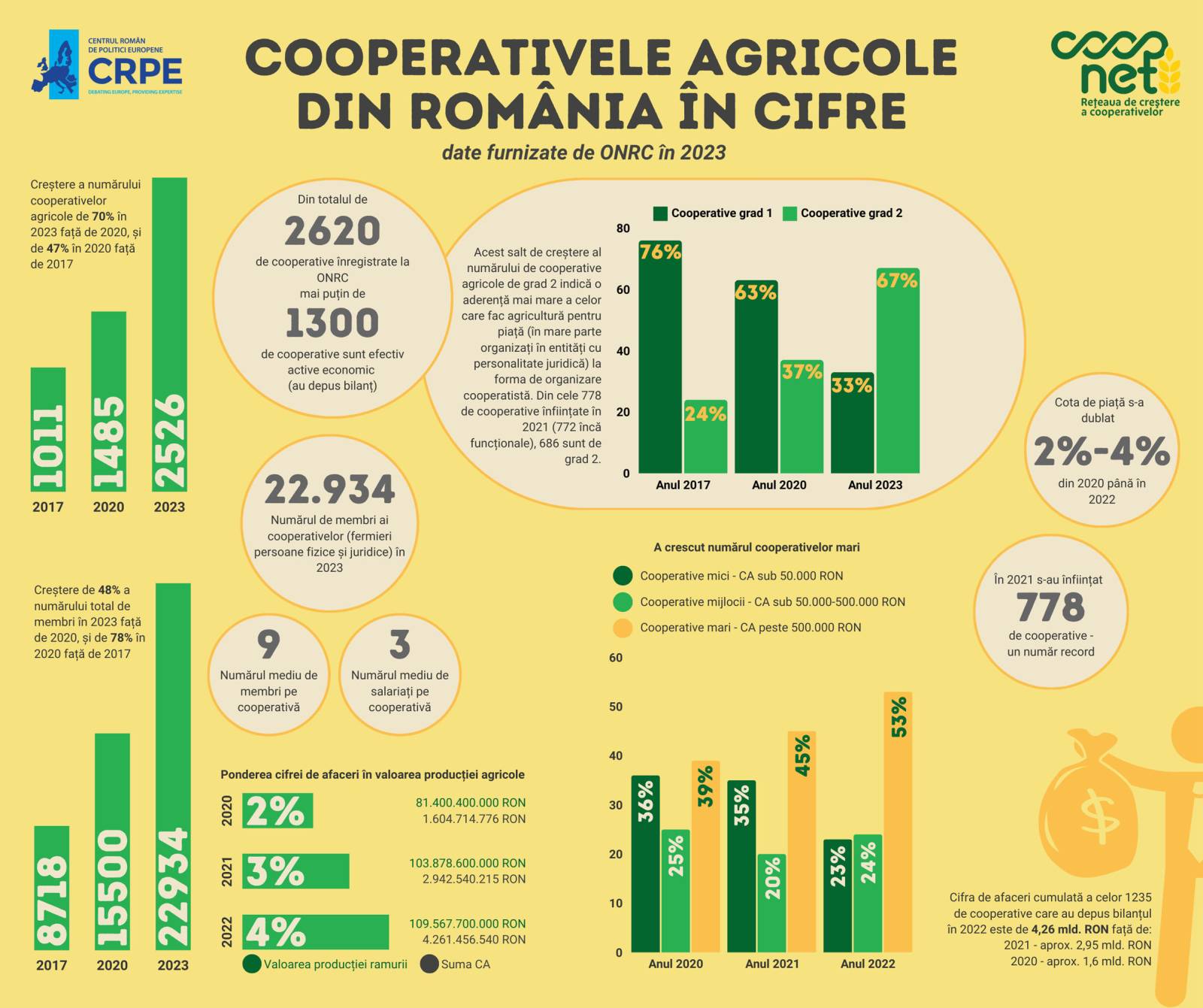 Chiar și în aceste condiții agricultura cooperatistă crește puternic, potrivit datelor centralizate de CRPE. Astfel, în anul 2023 în România existau 2.620 cooperative agricole, în creștere cu 70% față de 2020, din care 2.526 erau în funcțiune. Recordul absolut în ceea ce privește numărul de noi cooperative înființate a fost înregistrat în anul 2021 – 778.