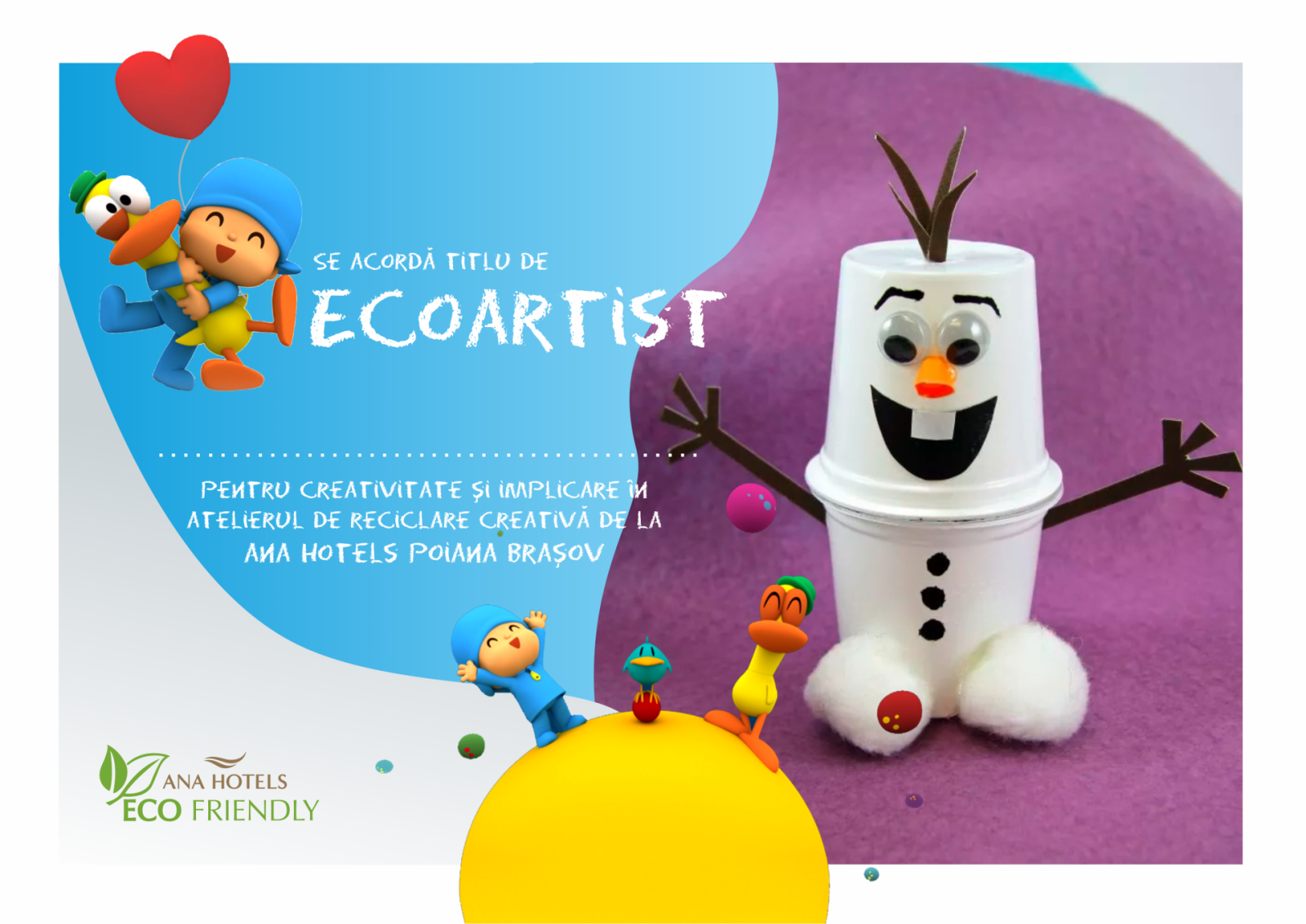 Atelierele de reciclare creativă sunt gratuite și se adresează tuturor oaspeților Ana Hotels Poiana Brașov. La finalul atelierelor, fiecare copil va primi o diplomă de “EcoArtist” și obiectele reciclate creativ chiar de ei.