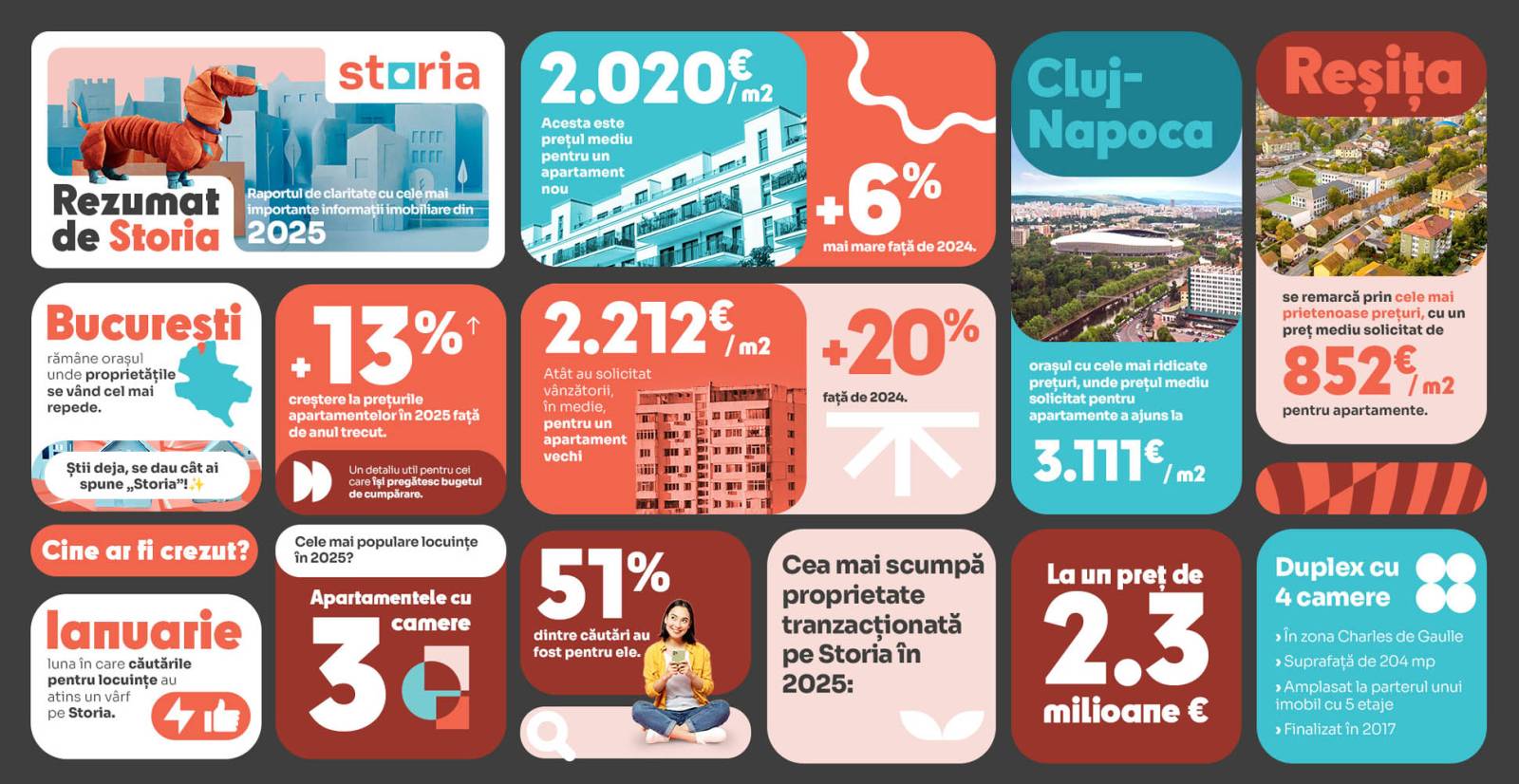 Apartamentele cu trei camere au fost cele mai populare în 2025, reprezentând 51% dintre căutările pentru acest tip de locuință. Cluj-Napoca a avut cele mai ridicate prețuri, cu o medie de 3.111 euro/mp, în timp ce Reșița s-a remarcat prin cele mai accesibile valori, cu un preț mediu solicitat de 852 euro/mp. Cea mai scumpă proprietate tranzacționată prin Storia a avut un preț de 2,3 milioane de euro.