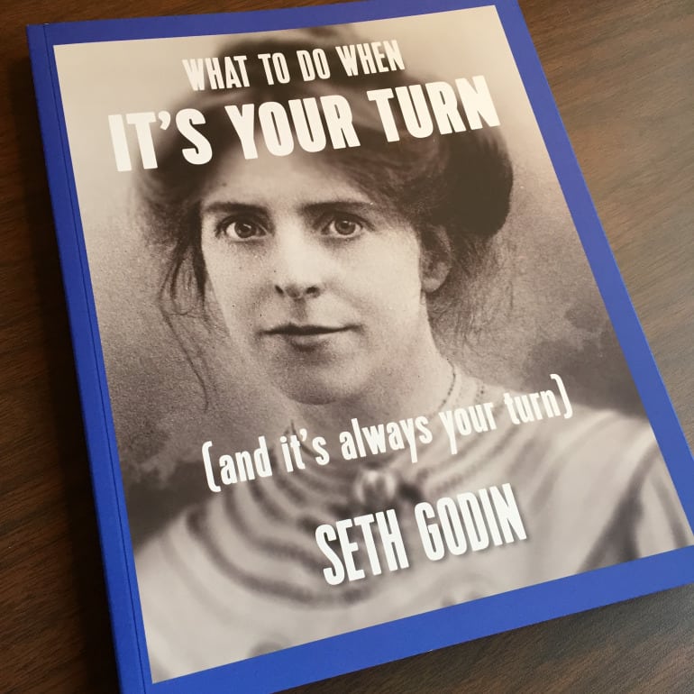 Coperta o infatiseaza pe Annie Kenney, un simbol al miscarii sufragetelor pentru emanciparea femeilor de la inceputul secolului XX. Printre personalitatile despre care Seth Godin scrie in aceasta carte se numara: Miles Davis, Stephen King, Neil Gaiman, Leonardo da Vinci, Richard Nixon, Isaac Asimov, Ella Fitzgerald, Gutenberg, Shirley Chisholm, Heisenberg, Madame Curie, David Crosby. Cartea poate fi comandata online pe www.yourturn.link. Pretul unui exemplar este de 34 de dolari plus taxele de expediere.