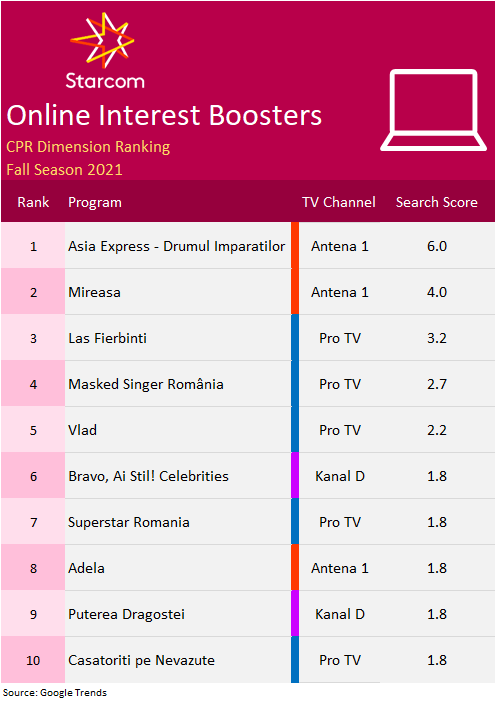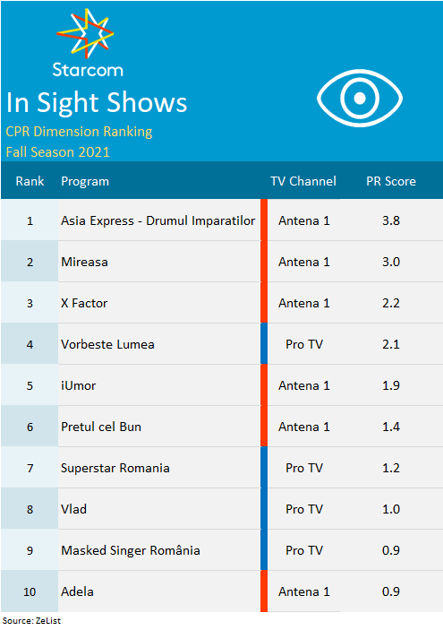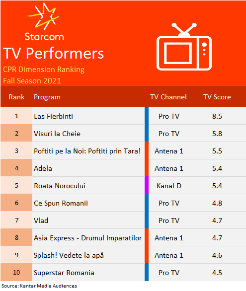 Reading Time: 5 minuteStudiul Content Power Ratings, realizat de Starcom România care are la bază un sistem inovator de ierarhizare a programelor TV, indică faptul că topul emisiunilor televizate preferate de publicul român în sezonul toamnă 2021 a fost condus de Asia Express – Drumul Împăraților, urmată de Las Fierbinți.