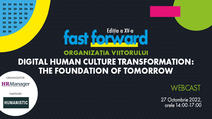 Reading Time: 2 minuteEvenimentul „Fast Forward. Organizația Viitorului”, organizat de Revista HR Manager cu sprijinul Humanistic, pune accent pe tehnologia și dezvoltările care influențează cultura organizațională în ediția a XI-a. Desfășuartă online pe 27 octombrie, între orele 14-17, conferința va avea ca temă „The digital human culture transformation: The foundation of tomorrow”. Se vor dezbate idei, inițiative, se vor prezenta studii și proiecte implementate în companii.