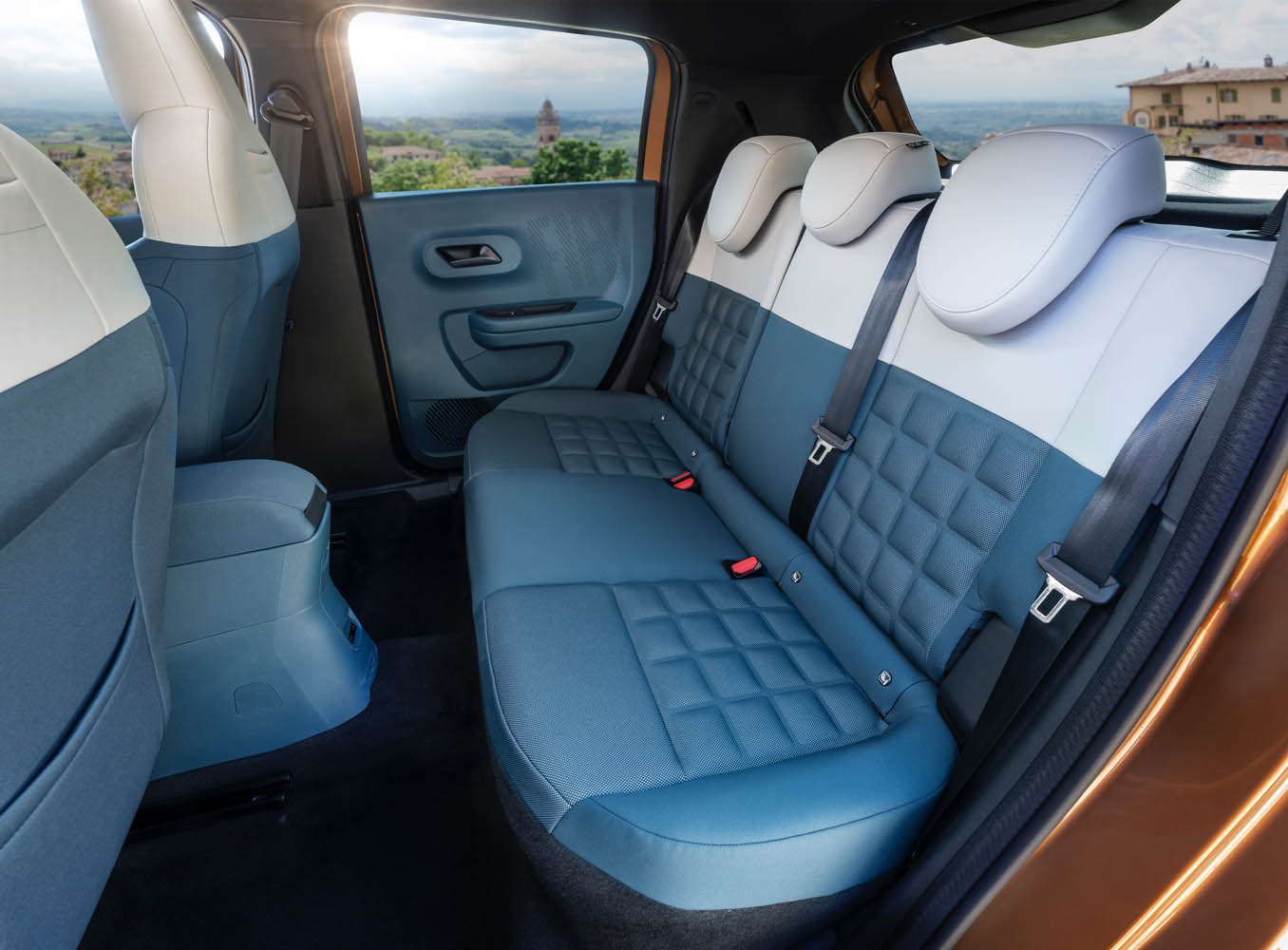Exteriorul compact al lui Grande Panda ascunde un interior neașteptat de spațios, oferind cel mai generos spațiu pentru umeri din clasa sa, spații de depozitare modulare și un design expresiv. Tema cromatică principală Blu Tasmania a habitaclului este energizată de accentele de galben strălucitor de pe planșa de bord, zona de infotainment și cusăturile scaunelor. Portbagajul are o capacitate de 412 litri, iar în habitaclu mai sunt disponibili 13 litri în planșa de bord, din care 3 litri într-un singur compartiment de depozitare.
