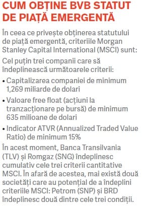 Potrivit metodologiei FTSE, pentru a fi promovată în categoria piețelor emergente (secondary emerging), România trebuie să atingă un nivel al lichidității anuale a pieței de 15% din capitalizare, în prezent indicatorul fiind la nivelul de aproximativ 8%. Următoarea evaluare a FTSE va avea loc în septembrie 2018.