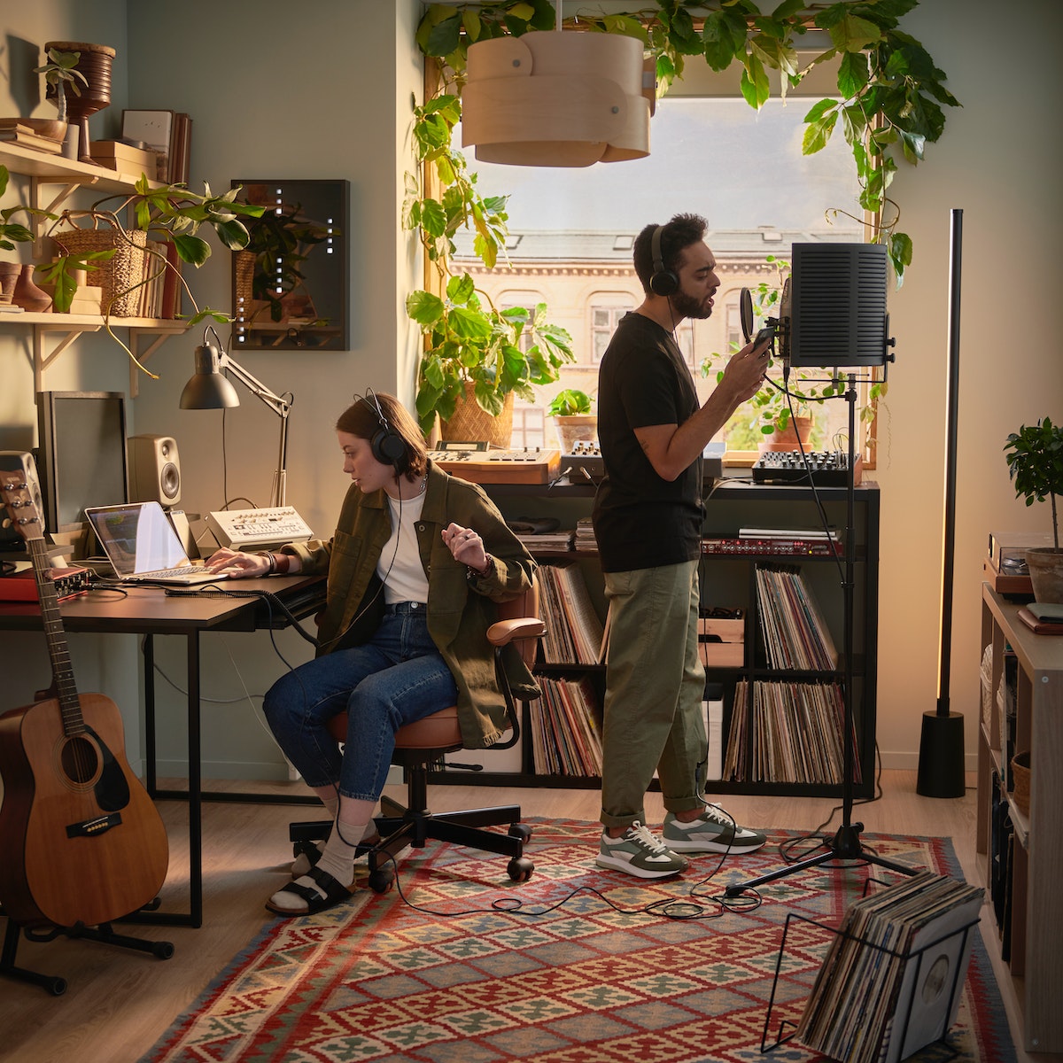 Producătorii muzicali aflați la început de drum vor aprecia etajerele realizate pe modelul etajerelor KALLAX, oferind spațiu extra pentru amplificatoare și boxe, de biroul OBEGRÄNSAD cu spațiu dedicat boxelor și cu rafturi retractabile, precum și de suporturile OBEGRÄNSAD pentru laptop, tabletă și boxe.