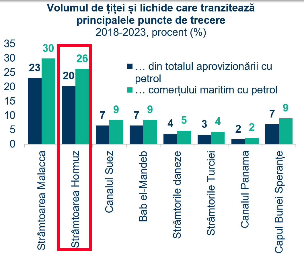 Principalul risc îl reprezintă Strâmtoarea Hormuz, prin care tranzitează aproximativ 20% din petrolul consumat la nivel mondial și aproape 30% din transporturile maritime de țiței. Întreruperile actuale duc deja la creșterea prețurilor.