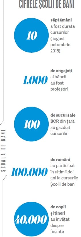 Un studiu realizat de Banca Mondială la nivelul Uniunii Europene şi prezentat în cadrul celei de a doua ediţii a European Money Week din acest an a plasat România pe ultimul loc din 127 de țări calificate. Procentajul nostru este de 22%, în condițiile unei medii europene de 55% privind educația financiară a oamenilor. Acesta este motivul pentru care BCR a lansat cea mai mare campanie de educație financiară din România: timp de 10 săptămâni, 1.000 de angajați oferă, în 100 de sucursale bancare din întreaga țară, cursuri gratuite la Școala de bani, fiind pregătiți să acționeze ca adevărați profesori de educație financiară. Conținutul educațional a fost creat de un partener extern al BCR, Silvia Bogdan de la Disruptive Thinking. Cursurile sunt gratuite și au loc în afara orelor de lucru cu publicul din unitățile BCR, care sunt marcate vizual și a căror disponibilitate poate fi verificată pe site-ul dedicat creat de instituția financiară.
