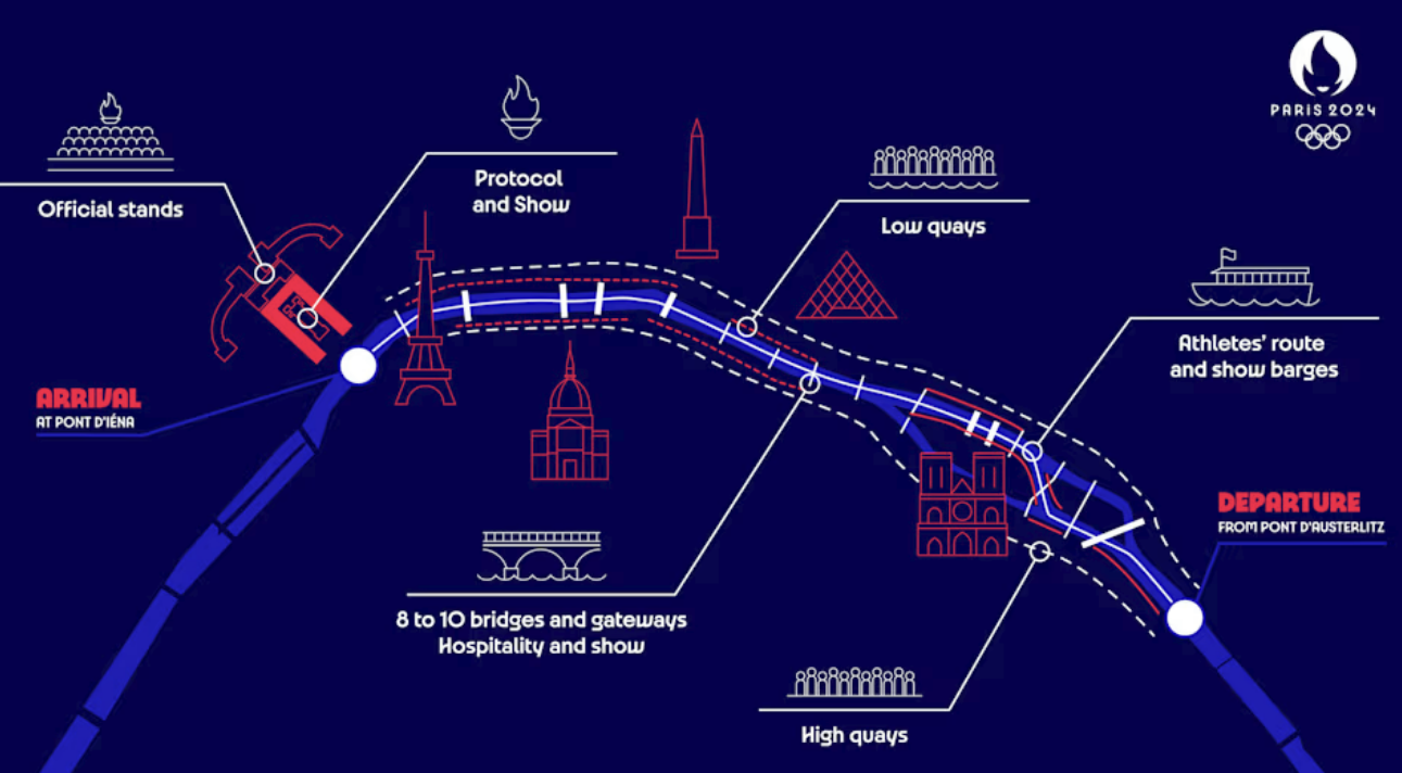 La ora locală 19:30 (20:30, ora Românei), 3.000 de dansatori, muzicieni şi actori vor anima un traseu de şase kilometri, care pornește de la Pont d’Austerlitz, lângă Jardin des Plantes, și se continuă de-a lungul râului Sena până la Turnul Eiffel, unde a fost construită o scenă special pentru eveniment. Întregul spectacol va dura 3 ore și 45 de minute și va marca startul oficial al celor 17 zile de Jocuri Olimpice 2024.