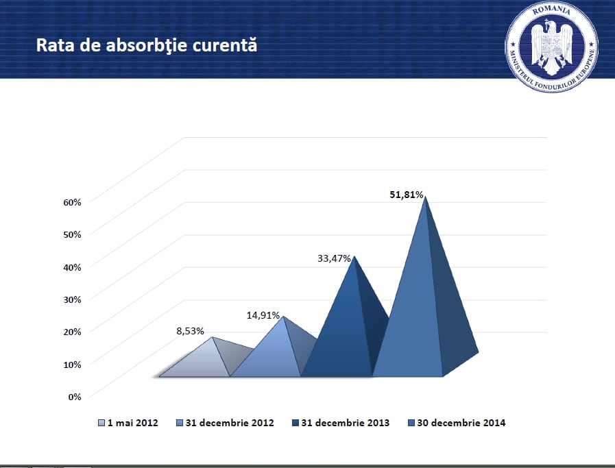 Reading Time: 2 minuteRata de absorbtie curenta a fondurilor structurale si de coeziune a ajuns la 51,81% la data de 30 decembrie 2014. Astfel, rata de absorbtie curenta este de 6 ori mai mare decat la inceputul lunii mai 2012 si de 3,5 ori mai mare decat la sfarsitul anului 2012. Suma solicitata Comisiei Europene pentru a fi rambursata Romaniei a ajuns la aproximativ 10 miliarde de euro. Totodata, suma totala incasata de Romania din fondurile alocate a ajuns la 10,73 miliarde de euro, valoare care include avansurile si rambursarile.