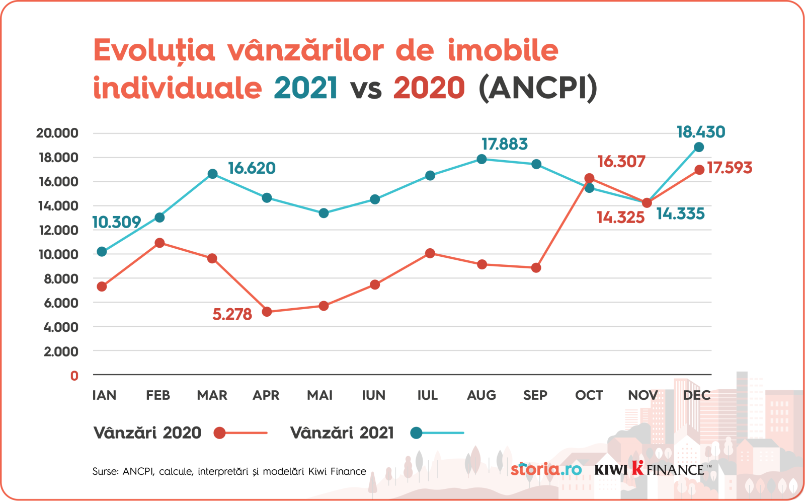 De asemenea, Kiwi Finance și Storia.ro prezintă în premieră o statistică foarte aproape de realitate privind tranzacțiile imobiliare efectuate de persoane fizice. Astfel, potrivit ANCPI, tranzacțiile imobiliare încheiate de persoane fizice în anul 2021 au totalizat 183.032, în creștere cu 49% față de anul anterior, când au totalizat 123.126 (vezi grafic cu evoluția lunară).