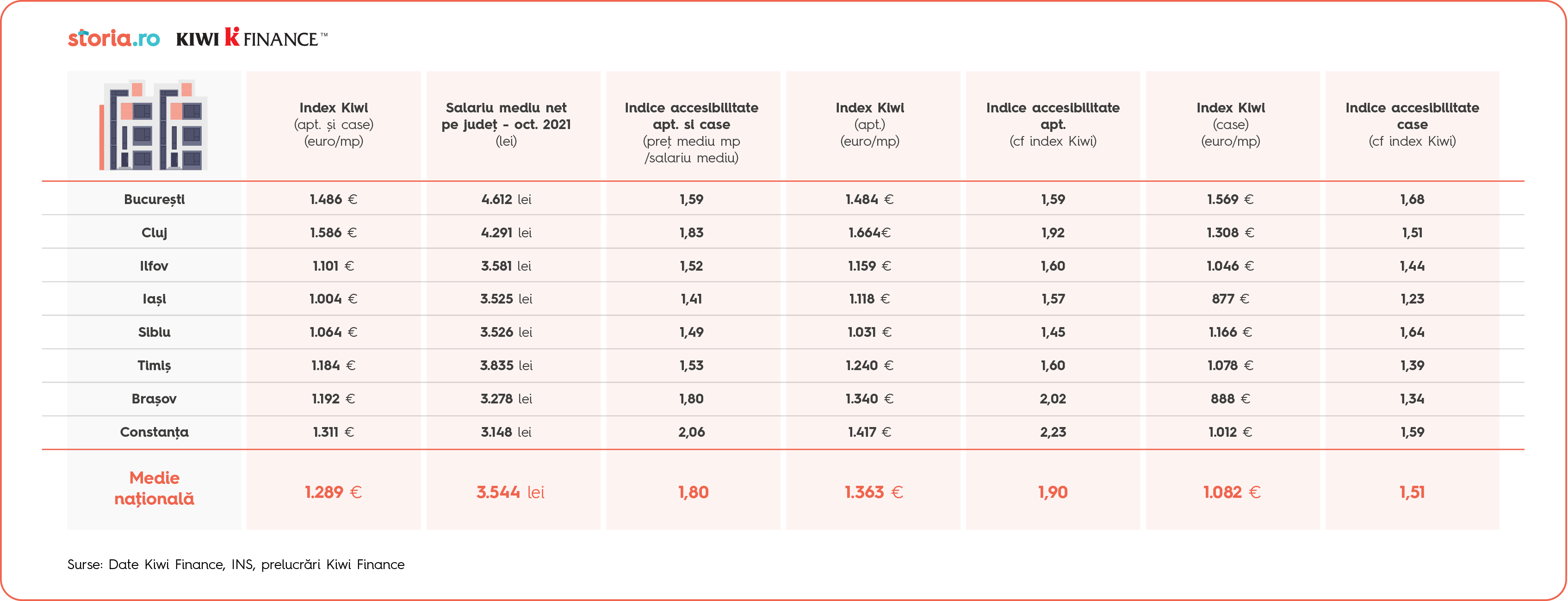 Prima valoare a indexului imobiliar Kiwi Finance la nivel național este de 1.289 euro/mp la finalul lunii decembrie, echivalentul unui multiplu de 1,8 ori salariul mediu net, ceea ce indică cel mai bun grad de accesibilitate de după 2004.