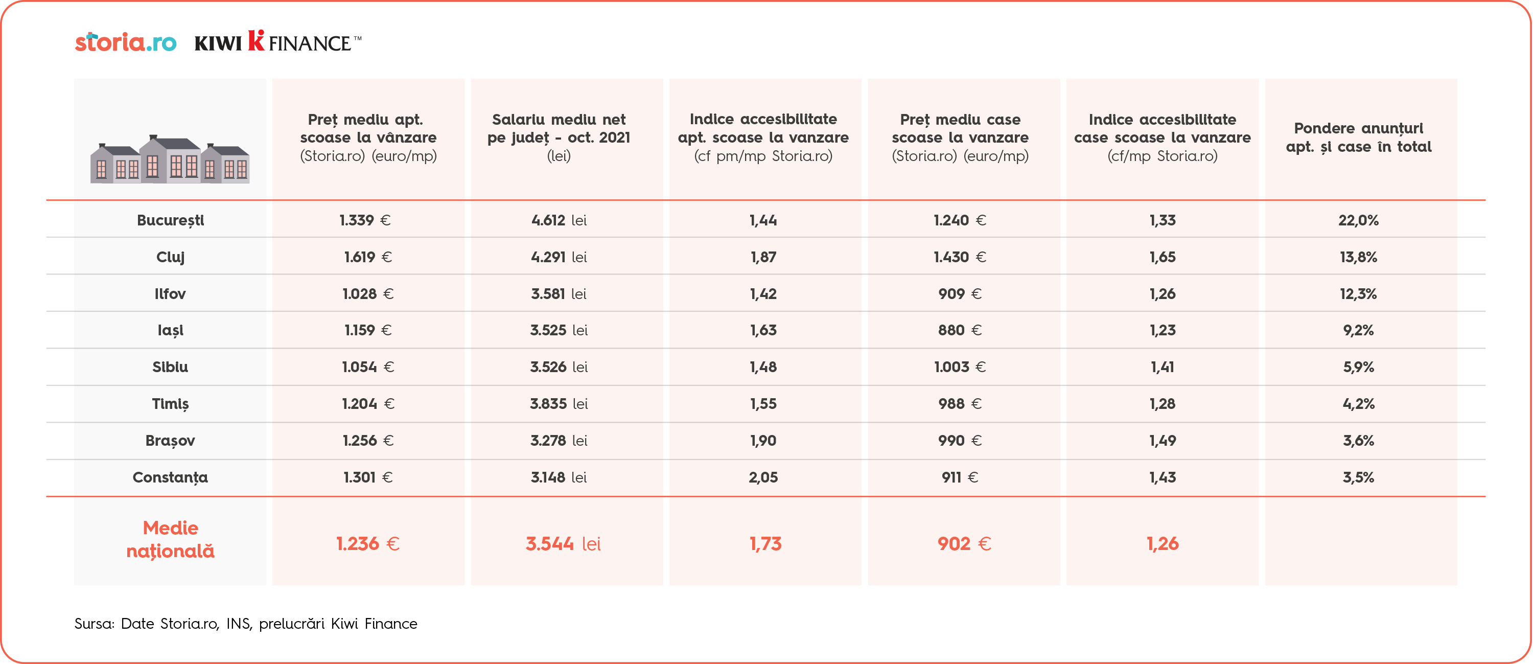 În ceea ce privește prețurile medii/mp la apartamente și case conform componentelor indexului imobiliar Kiwi Finance, acestea sunt relativ apropiate de prețurile medii/mp conform anunțurilor de pe Storia.ro, platforma imobiliară cu cele mai multe anunțuri, lansată de OLX. Asta denotă faptul că marja de negociere în piața imobiliară este destul de redusă, undeva în intervalul 3%-7%, iar unde ofertele depășesc cu mult nivelul cererii rămân fără contraparte.
