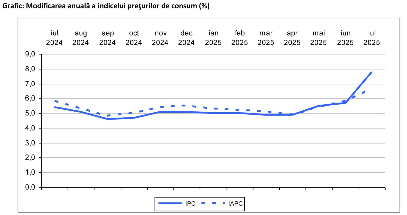 Rata medie a modificării prețurilor de consum în ultimele 12 luni (august 2024 – iulie 2025) față de precedentele 12 luni (august 2023 – iulie 2024) determinată pe baza IAPC a fost 5,4%.