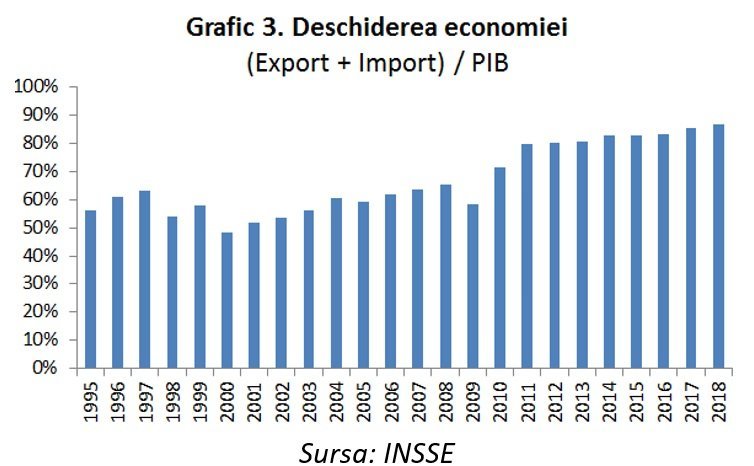 Liberalizarea deplină a contului de capital (Septembrie 2006) și convertibilitatea deplină a monedei naționale, dublată de creșterea stabilității financiare a economiei românești (dobânzi, inflație și fluctuația monedei sub 5% pentru majoritata anilor din ultimul deceniu), au determinat creșterea gradului deschiderii economiei de la 50% (1999) la 86% (2018) precum și avansul ISD (vezi graficele 3 și 5). În schimb, progresul acestora a fost net inferior țărilor din regiune |