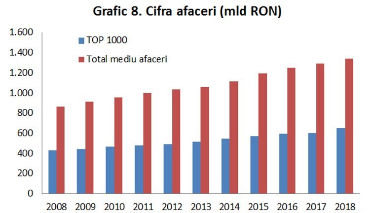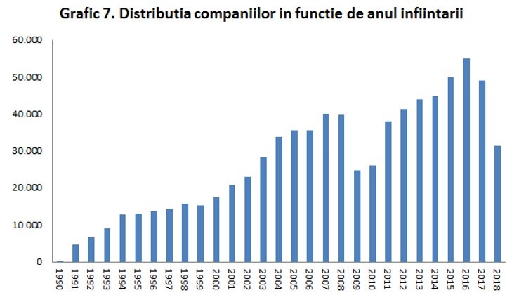 Concurența în momentul de față este foarte ridicată în majoritatea sectoarelor, cu excepția unor segmente de niște prin servicii customizate oferind oportunitatea unor oaze de monopol / oligopol. Mediul de afaceri este extrem de concentrat în rândul marilor companii, iar pătura de mijloc este foarte redusă. Practic, cele mai mari 1000 de firme din perspectivă veniturilor, concentrează aproape jumătate din cifra de afaceri raportată de cele aproape 500.000 de companii care sunt active în România (vezi graficul 8). Practic, una din două firme active în România este infiintată după impactul pe plan local al crizei financiare globale din perioadă 2007-2008, fiind astfel predispusă la un comportament emoțional în următoarea perioadă de recesiune și ajustare economică. La capătul celălalt, doar două din zece companii active în România sunt înființate înainte de anul 2000 (nucleul companiilor mature) – vezi graficul 7. |