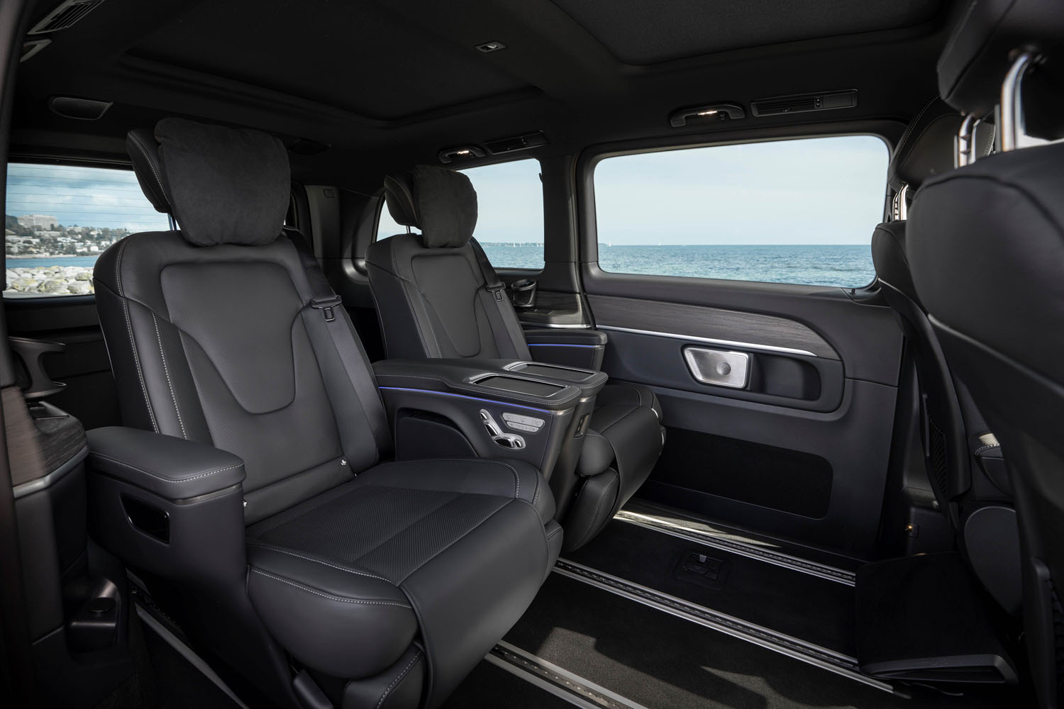 Consola centrală, care a fost, de asemenea, reproiectată, suportă încărcarea wireless pentru smartphone-uri. Alte dotări noi de confort, dintre care unele sunt opționale, includ funcția de pornire KEYLESS, volanul încălzit și iluminarea discretă a cabinei din spate pentru condusul pe timp de noapte. Cu 64 de culori, iluminarea ambientală oferă o atmosferă și mai familiară. Pentru un acces mai facil în partea din spate, Clasa V și EQV au acum, de asemenea, o ușă glisantă pe partea stângă a autovehiculului, în dotarea standard.
