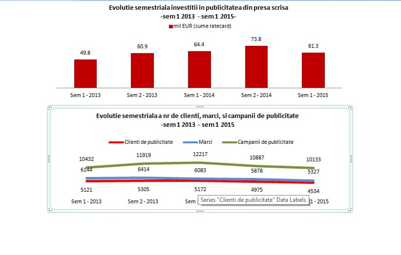 Analizand publicatiile cu aparitie continua in intervalul ianuarie 2013 – iunie 2015 se constata ca, dupa cresterea care a marcat sfarsitul anului 2013 si intreg anul 2014, primul semestru al acestui an aduce o usoara scadere a volumelor investite in zona presei scrise. Aceasta se remarca si la nivelul spatiului publicitar ocupat, care a scazut de la 12.000 pagini in prima parte a lui 2014, la aproximativ 10.500 pagini in 2015, precum si la nivelul numarului de clienti de publicitate si al marcilor comunicate de acestia.