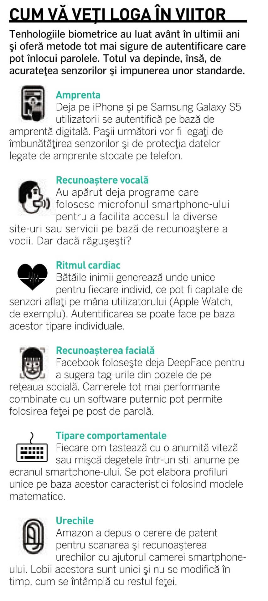 Sistemele biometrice bazate pe amprente, recunoastere vocala sau faciala, scanarea irisului, ba chiar si pe ritmul cardiac, promit o securitate sporita, dar nu sunt lipsite de probleme. Sigur, se bazeaza pe caracteristici unice ale fiecarui om. Hackerii nu-ti pot ghici amprenta, iar tu nu o poti uita sau pierde. Un alt avantaj este ca amprenta, vocea sau alt indicator biometric pot fi folosite fara probleme pentru orice site sau serviciu, deci nu mai trebuie sa tineti minte zeci de parole. Cealalta fata a monedei este insa legata de flexibilitate si disparitia anonimitatii. In plus, autentificarea biometrica necesita hardware si software special. Tot mai multe smartphone-uri au senzori de amprente, dar va mai dura ani buni pana cand acestea vor ajunge la suficient de multi oameni. Va urma apoi batalia standardelor, pentru ca sistemele sa poata comunica eficient intre ele si sa te poti loga peste tot cu aceeasi metoda.