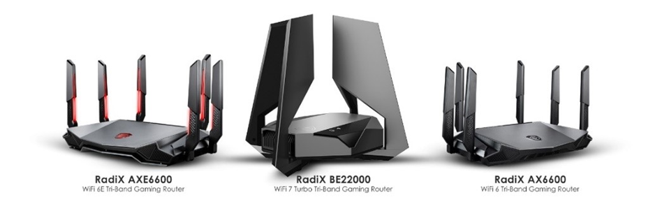 Linia MSI RadiX este o serie de routere de gaming care dispun de QoS asistat de AI, care poate reduce rata de ping cu 90% pentru a oferi o latență extrem de scăzută pentru gameri. RadiX BE22000 Turbo adoptă tehnologia Wi-Fi 7 și antene cu detecție automată care schimbă modelele antenelor pentru a urmări locația dispozitivului, îmbunătățind acoperirea semnalului. Modulul termic de prim rang asigură ultra-performanțe pentru RadiX AXE6600 și AX6600 chiar și în condiții de trafic intens.