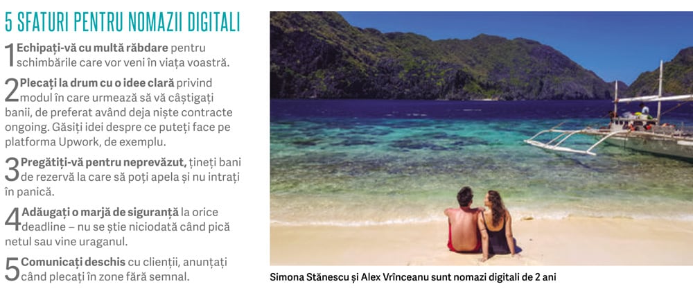 A fost nevoie de un email în plus pentru ca Simona Stănescu să-mi trimită din Costa Rica un set de fotografii care să ilustreze experiența ei de nomad digital alături de Alex Vrînceanu. Motivul? „Peste noapte a picat netul, sunt acum în proces de retrimitere a fotografiilor către tine”, mi-a scris Simona. Problema s-a rezolvat rapid și pozele au ajuns la timp. Slavă zeilor internetului! Aceiași „zei” care le permit celor ca Simona și Alex să se bucure oricând de călătoriile la care au visat, muncind în același timp chiar din locurile pe care le vizitează. Cam așa s-ar defini, pe scurt, nomazii digitali. Este un stil de viață invidiat de la distanță de cei care-i urmăresc pe cei ca Simona și Alex (o puteți face și voi pe lipa-lipa.ro), dar care nu vine fără probleme la pachet. Una dintre ele fiind chiar cea descrisă mai sus – internetul mai cade sau merge prost și, fără el, nu prea poți să trimiți către client ce ai muncit. Iar dacă ai un deadline strict, pot apărea probleme.
