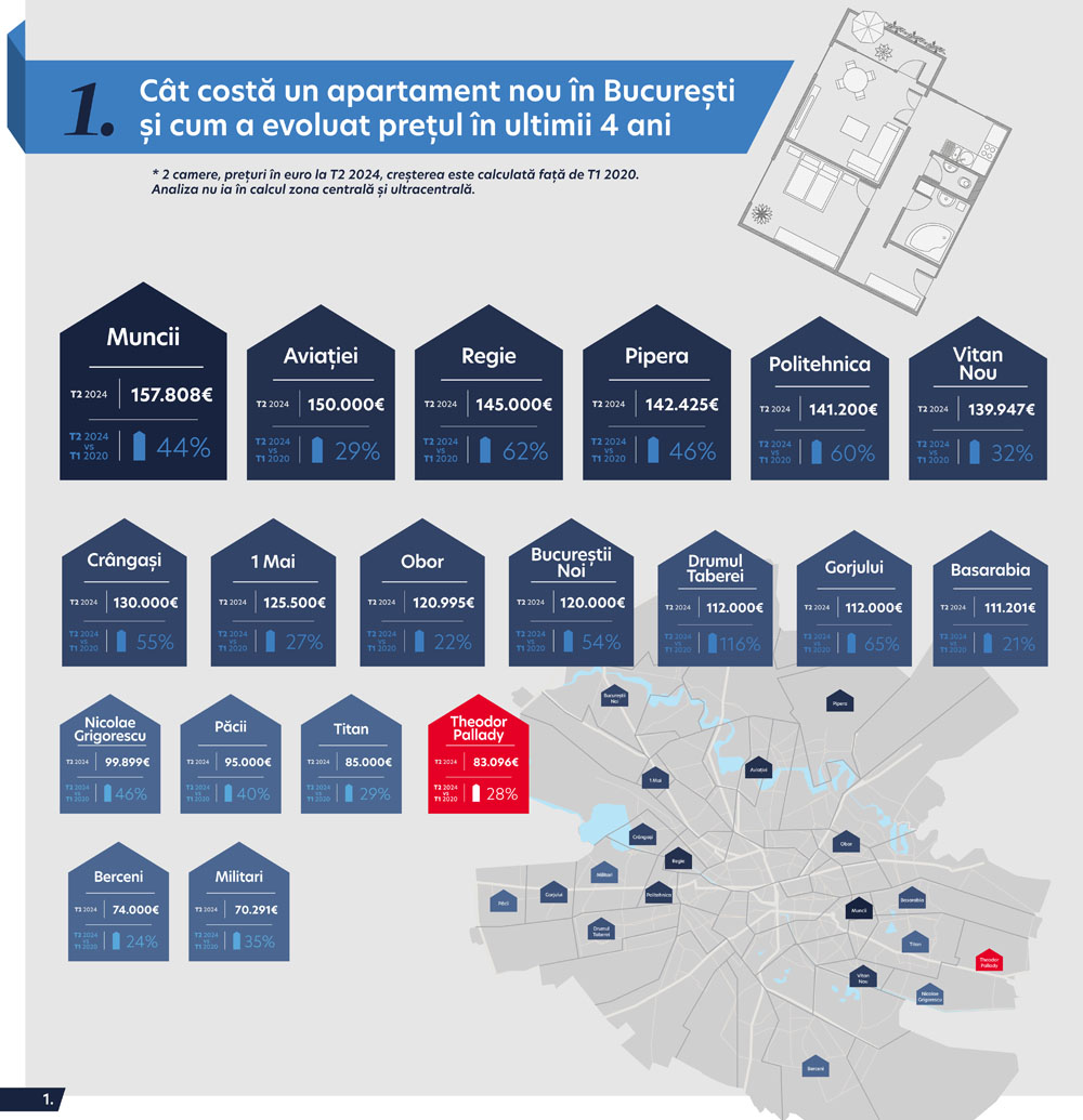 Prețurile apartamentelor noi cu 2 camere au crescut în București între 21% și 116% față de 2020. Cele mai mici creșteri, de până la 25%, s-au înregistrat la locuințele din zonele Bulevardul Basarabia (111.201 euro), Obor (120.995 euro) și Berceni (74.000 euro). Creșterile maxime au fost în zonele Drumul Taberei (+116%), Gorjului (+65%) și Regie (+62%), unde prețurile medii au ajuns la 112.000 euro (Drumul Taberei și Gorjului) și 145.000 euro (Regie).