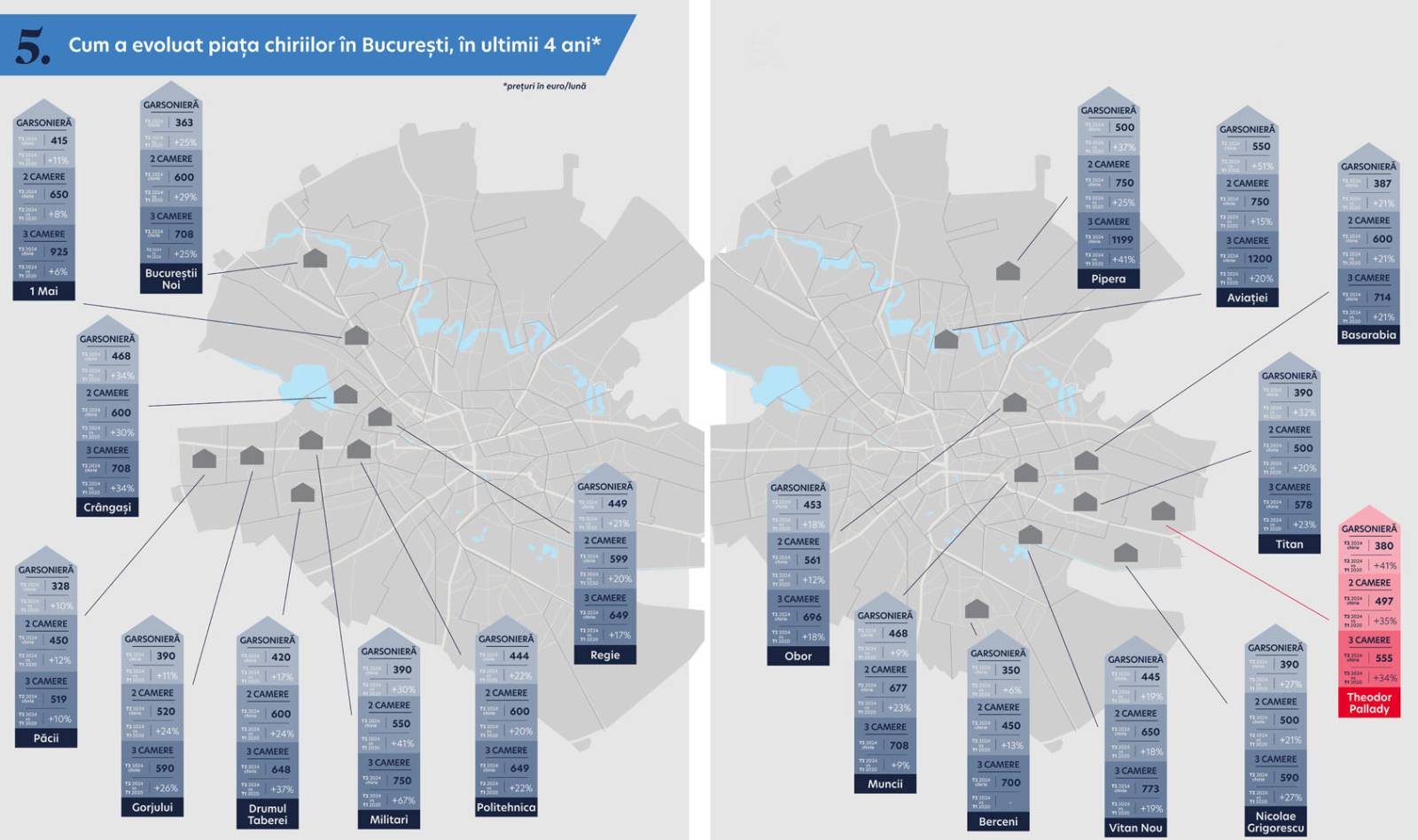 - Apartamente 3 camere: chiria medie a crescut cu 34%, atingând 555 euro. Creșteri mai mari s-au înregistrat în Drumul Taberei, Pipera și Militari.