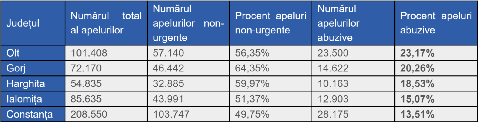Județele unde s-au efectuat cele mai multe apeluri abuzive: