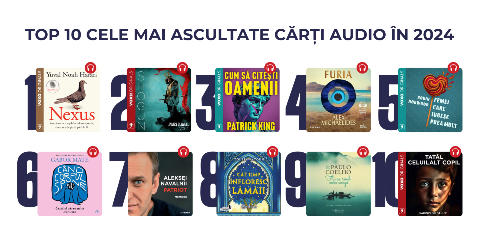 La capitolul cele mai bine primite lansări în format audio în 2024 se remarcă titluri precum „Hoața de cărți,” tradusă în 63 de țări, cu 17 milioane de exemplare vândute, „Istoria secretă,” tradusă în 30 de țări, cu 5 milioane de exemplare vândute, și „Legământul apei,” desemnată cartea anului 2023 în SUA, aflată în topul NYT timp de 40 de săptămâni.